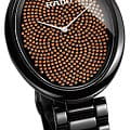 Женские керамические швейцарские часы с бриллиантами Rado Esenza R53094752, кварцевый механизм с высокой точностью. Сапфировое стеклоСапфировое стеклоПрочный и надёжный материал из кристалла сапфира синтетического происхождения, характеризующийся особой твёрдостью и устойчивостью к царапинам и повреждениям. устойчивое к появлению царапин, обладающее высокой прозрачностью. Класс водозащиты: 30 метров, позволит защитить корпус от случайных брызг или капель дождя. Корпус и браслет часов изготовлены из высокотехнологичной керамикиВысокотехнологичная керамикаИнновационный запатентованный Rado материал с гладкой или матовой поверхностью. Керамика за счёт кристаллической структуры обладает повышенной устойчивостью от возникновения царапин. Материал способен принимать температуру тела человека, обеспечивая невероятный комфорт при ношении.. Браслет на раскладной застёжкеРаскладная застёжкаТакой тип застёжки используется только на браслетах из металла. Она никогда не раскрывается полностью, происходит разделение на 2 и более частей. Раскладывающая застёжка снизит вероятность потери часов к минимуму.. Циферблат декорирован 534 оранжевыми сапфирами .801 карат.