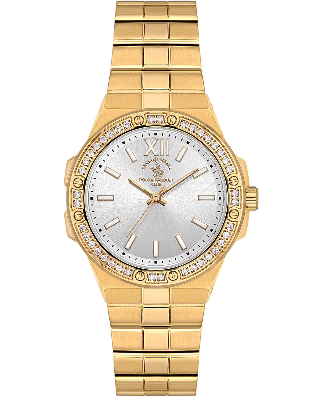 Женские кварцевые часы Santa Barbara Polo & Racquet Club Luxury SB.1.10575-2 — это стильный аксессуар, подчеркивающий индивидуальность. Изысканный корпус диаметром 32 мм выполнен из нержавеющей стали 316L с IP-покрытиемIP-покрытиеМетод ионного напыления. Демонстрирует повышенную устойчивость к истиранию, окислению и химическим веществам. Под воздействием высокого давления и температуры около 1500°C молекулы металла надёжно соединяются с частицами корпуса часов. и украшенным кристаллами на безелеБезельВнешний ободок, закрепляющий стекло. В спортивных часах так называется поворотное кольцо с делениями на циферблате, выполняет роль таймера – замеряет отрезки времени на шкале. Неподвижный безель – элемент декора. Однонаправленно вращающийся безель на дайверских часах позволяет фиксировать моменты погружения и выныривания на поверхность.. Изящный циферблат дополнен крупными накладными мтеками в виде штрихов и римской цифры XII, а также фирменным логотипом. Метки и стрелки в стиле Baton с люминесцентным покрытиемЛюминесцентное покрытиеПозволяет считывать показания времени в темноте. Производители наносят на стрелки, часовые индексы, безель или поверхность циферблата светонакопительный состав, дающий холодное свечение., обеспечивающим хорошую читаемость в темноте. Защиту циферблата обеспечивает минеральное стеклоМинеральное стеклоМинеральное стекло представляет собой искусственно выращенный минерал кварца. Такое стекло отличается особой устойчивостью к повреждениям и царапинам. Уступает по некоторым качествам сапфировому стеклу., устойчивое к мелким механическим повреждениям. Часы оснащены надежным стальным браслетом с IP-покрытиемIP-покрытиеМетод ионного напыления. Демонстрирует повышенную устойчивость к истиранию, окислению и химическим веществам. Под воздействием высокого давления и температуры около 1500°C молекулы металла надёжно соединяются с частицами корпуса часов. с застёжкой-бабочкаЗастёжка "бабочка"Такой вид застёжки дополняется предохранителями, помогающими избежать случайного раскрытия браслета. Обладают изящным исполнением. . Водонепроницаемость 50 м позволяет использовать часы в повседневных условиях. Идеальный выбор для тех, кто ценит элегантный дизайн и качество.
