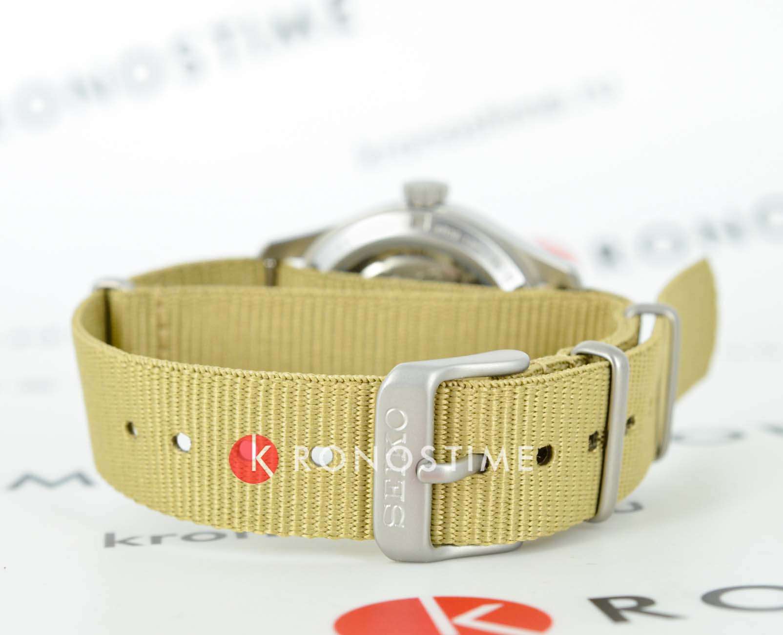 Модель Seiko SRPJ83K1 из серии Seiko 5 Sports Mid-Field — это компактные и надёжные автоматические часы в военном стиле с характерным «пустынным» оттенком. Корпус диаметром 36,4 мм выполнен из нержавеющей стали, оснащён прозрачной задней крышкой и обеспечивает водозащиту до 100 метров. Фиксированный стальной безельБезельВнешний ободок, закрепляющий стекло. В спортивных часах так называется поворотное кольцо с делениями на циферблате, выполняет роль таймера – замеряет отрезки времени на шкале. Неподвижный безель – элемент декора. Однонаправленно вращающийся безель на дайверских часах позволяет фиксировать моменты погружения и выныривания на поверхность. подчёркивает сдержанный и утилитарный дизайн модели. Песочный циферблат оформлен с акцентом на читаемость: крупная 12/24-часовая шкала, контрастные стрелки и метки с люминесцентным покрытиемЛюминесцентное покрытиеПозволяет считывать показания времени в темноте. Производители наносят на стрелки, часовые индексы, безель или поверхность циферблата светонакопительный состав, дающий холодное свечение. LumiBrite. На позиции «3 часа» расположены индикаторы даты и дня недели. Циферблат защищён прочным минеральным стекломМинеральное стеклоМинеральное стекло представляет собой искусственно выращенный минерал кварца. Такое стекло отличается особой устойчивостью к повреждениям и царапинам. Уступает по некоторым качествам сапфировому стеклу. Hardlex с куполообразной формой. Внутри установлен автоматический механизм Seiko 4R36 с функцией ручного подзавода, остановкой секундной стрелки, запасом хода до 41 часа и двойной календарной индикацией. Модель комплектуется текстильным ремешком NATOРемешок NATOРемешок NATO — это прочный, универсальный и сменный часовой ремешок, изначально созданный для военных. Он изготовлен из нейлона или другого прочного материала и имеет уникальную конструкцию, которая позволяет часам оставаться на запястье даже в случае поломки одной из прикрепляющих точек. песочного цвета шириной 18 мм — удобным, лёгким и устойчивым к износу. Seiko SRPJ83K1 — это универсальные полевые часы с характером и компактным корпусом, сочетающие практичность, военную строгость и надёжную механику.
