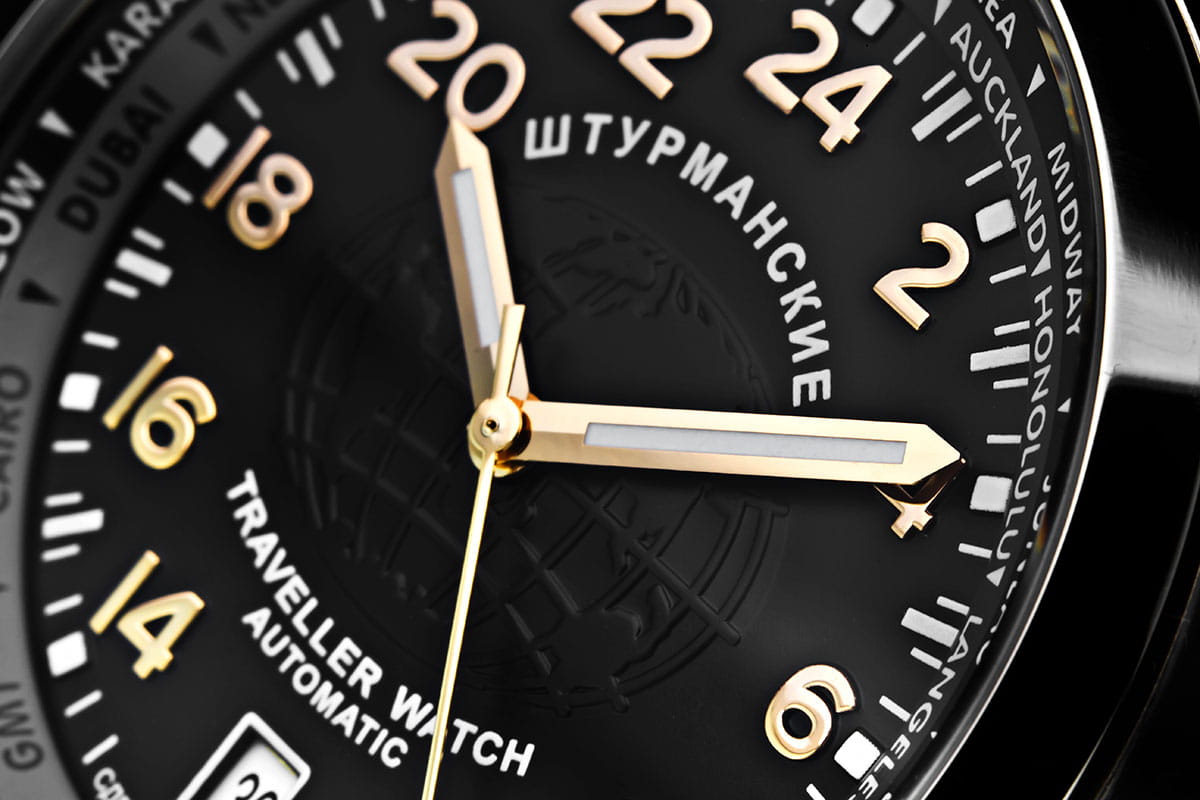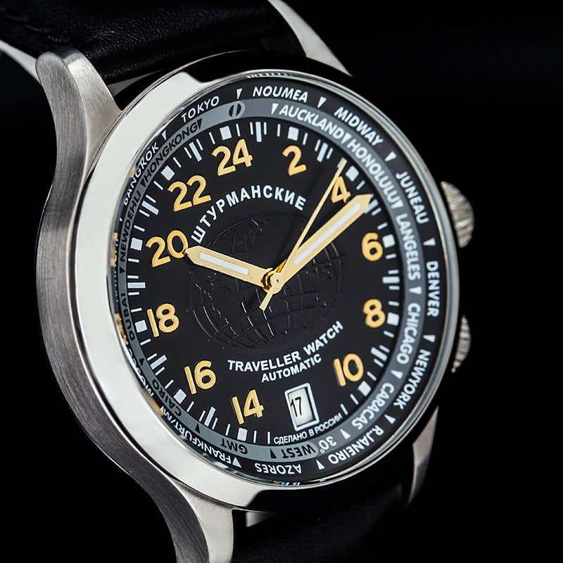 Мужские механические часы с автоподзаводом — это надёжный спутник в любых путешествиях. Корпус диаметром 42 мм выполнен из стали. Циферблат чёрного цвета оформлен индексами и стрелками. Присутствуют функции мирового времени (UTCМировое время Полезное часовое усложнение, отображающее время в основных городах и известных областях по всему миру, оно связано с часовыми поясами, удобно для путешественников и бизнесменов. ), 24-часового формата отображения времени и вращающийся внутренний безельБезельВнешний ободок, закрепляющий стекло. В спортивных часах так называется поворотное кольцо с делениями на циферблате, выполняет роль таймера – замеряет отрезки времени на шкале. Неподвижный безель – элемент декора. Однонаправленно вращающийся безель на дайверских часах позволяет фиксировать моменты погружения и выныривания на поверхность. для удобного определения часовых поясов. Окошко даты расположено в положении 6 часов. Циферблат защищён минеральным стекломМинеральное стеклоМинеральное стекло представляет собой искусственно выращенный минерал кварца. Такое стекло отличается особой устойчивостью к повреждениям и царапинам. Уступает по некоторым качествам сапфировому стеклу.. Часы оснащены кожаным ремешком на классической пряжке. Водонепроницаемость 100 м позволяет использовать часы для плавания и повседневного ношения. Идеальный выбор для тех, кто ценит отечественное качество и универсальный дизайн.