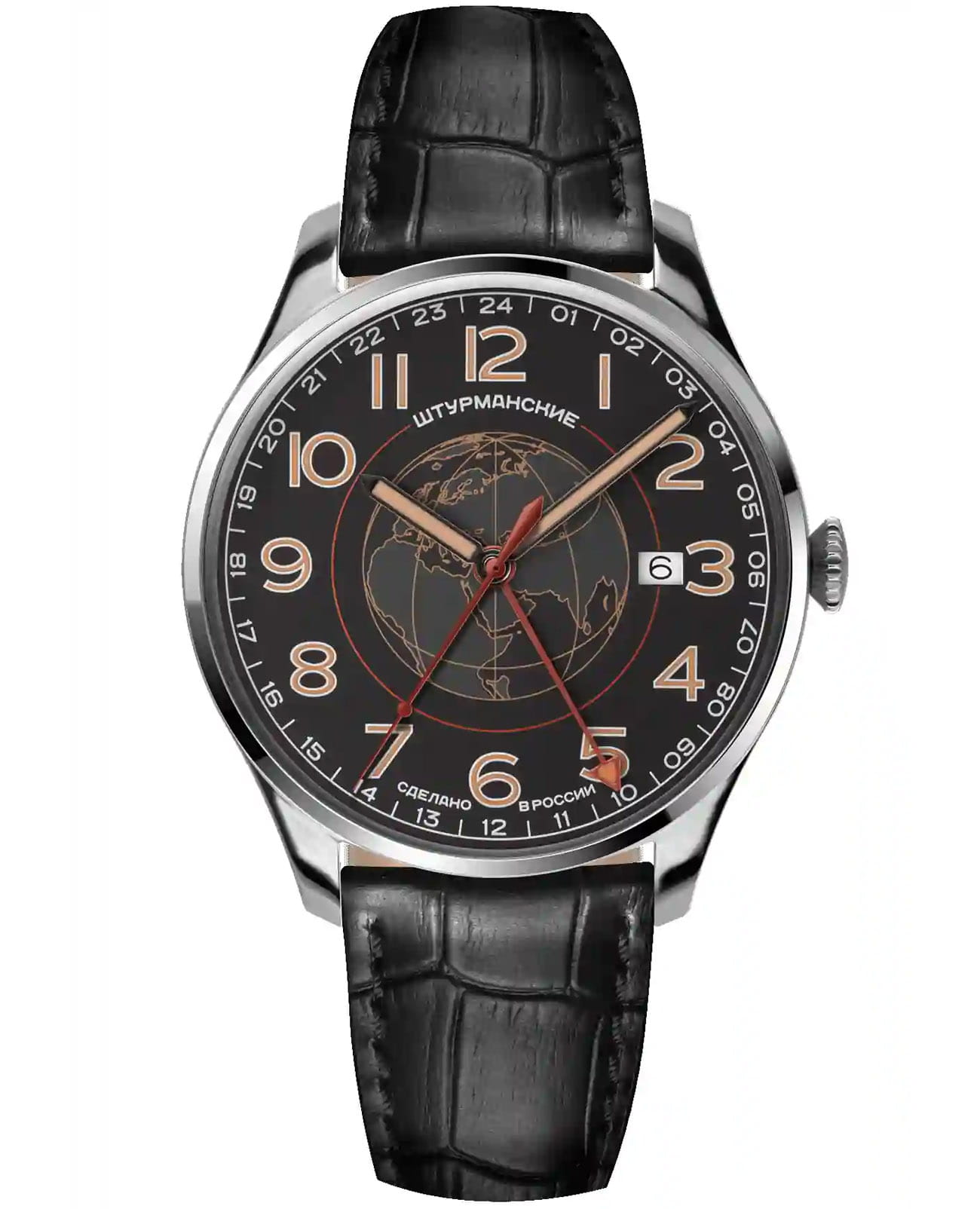 Штурманские мужские российские кварцевые часы с минеральным стекломМинеральное стеклоМинеральное стекло представляет собой искусственно выращенный минерал кварца. Такое стекло отличается особой устойчивостью к повреждениям и царапинам. Уступает по некоторым качествам сапфировому стеклу. кварцевый механизм с высокой точностью. Класс водозащиты: 50 метров, позволит защитить корпус от случайных брызг или капель дождя. Корпус часов изготовлен из стали. Кожаный ремешок на стандартной застёжке. Стрелки и метки с люминесцентным покрытиемЛюминесцентное покрытиеПозволяет считывать показания времени в темноте. Производители наносят на стрелки, часовые индексы, безель или поверхность циферблата светонакопительный состав, дающий холодное свечение.. Окошко даты находится в положении 3 часа.