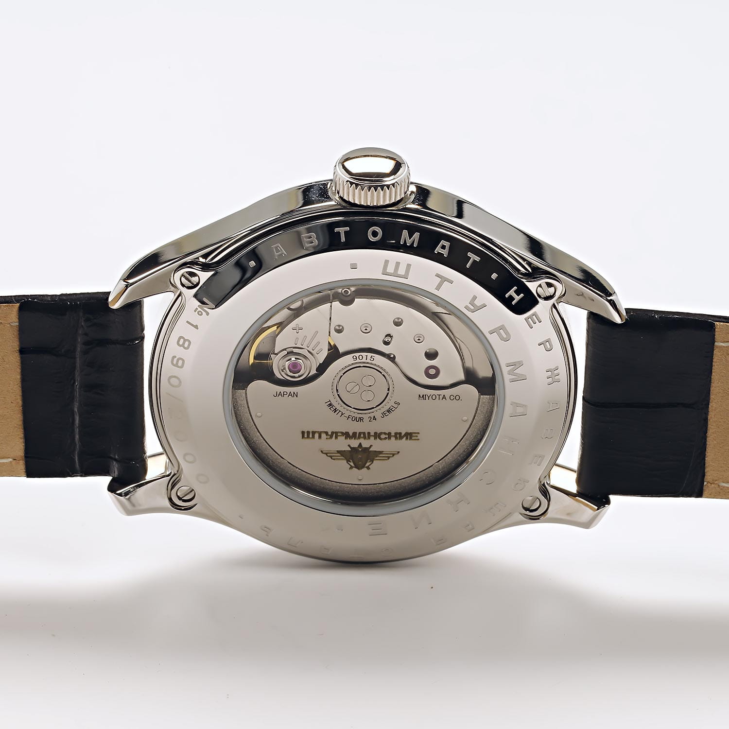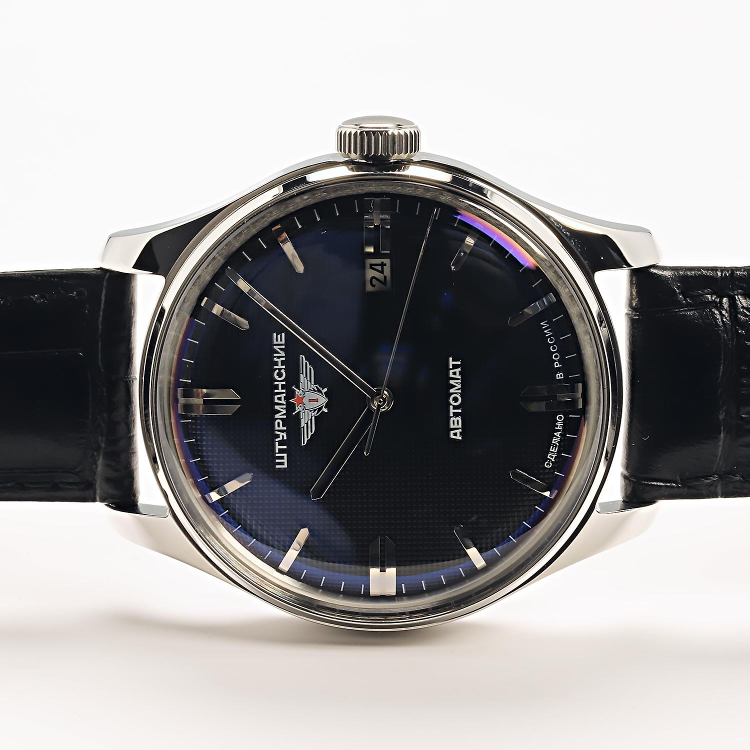 Мужские российские механические часы с минеральным стекломМинеральное стеклоМинеральное стекло представляет собой искусственно выращенный минерал кварца. Такое стекло отличается особой устойчивостью к повреждениям и царапинам. Уступает по некоторым качествам сапфировому стеклу. Штурманские Гагарин 9015/1271633, механизм с высокой точностью. Класс водозащиты: 50 метров, позволит защитить корпус от случайных брызг или капель дождя. Корпус часов изготовлен из стали. Кожаный ремешок на стандартной застёжке. Стрелки и метки с люминесцентным покрытиемЛюминесцентное покрытиеПозволяет считывать показания времени в темноте. Производители наносят на стрелки, часовые индексы, безель или поверхность циферблата светонакопительный состав, дающий холодное свечение.. Калибр Miyota 9015. В механизме 24 камня, частота 28800 полуколебаний в час. Запас хода 42 часа. Апертура даты.