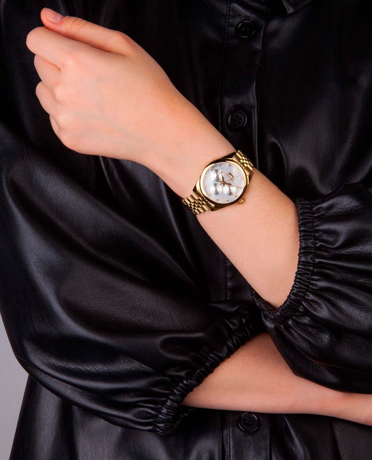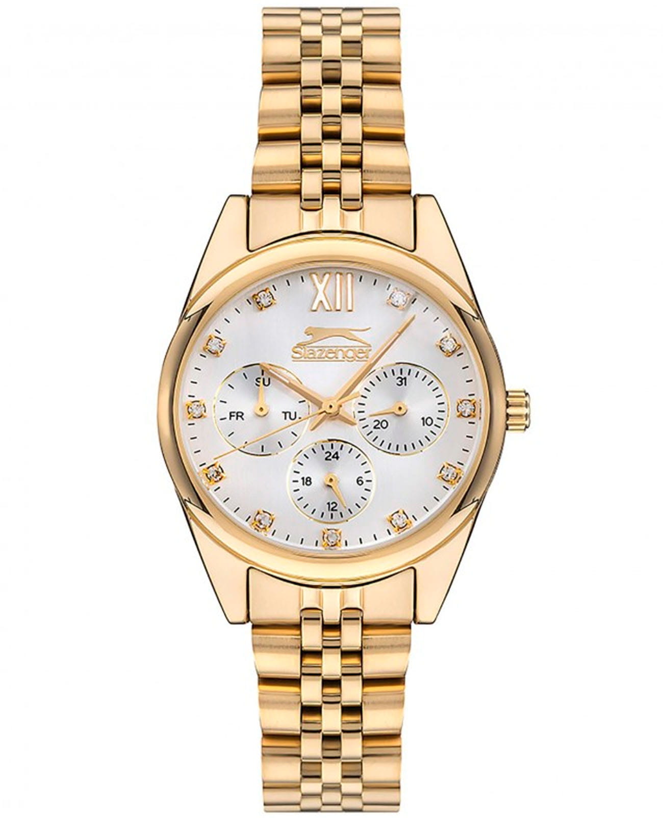 Женские наручные часы Slazenger SL.09.1990.4.04 сочетают в себе элегантный дизайн и практичность современных технологий. Модель обладает круглым корпусом диаметром 34 мм, изготовленным из суперметалла с IP-покрытиемIP-покрытиеМетод ионного напыления. Демонстрирует повышенную устойчивость к истиранию, окислению и химическим веществам. Под воздействием высокого давления и температуры около 1500°C молекулы металла надёжно соединяются с частицами корпуса часов., что обеспечивает высокую устойчивость к внешним воздействиям. Интегрированный браслет на пять звеньев выполнен из того же материала на раскладной застёжкеРаскладная застёжкаТакой тип застёжки используется только на браслетах из металла. Она никогда не раскрывается полностью, происходит разделение на 2 и более частей. Раскладывающая застёжка снизит вероятность потери часов к минимуму., гарантирующей комфортное ношение. Перламутровый циферблат оснащен индексами для лучшей читаемости времени и дополнен функцией отображения даты. Для защиты применяется минеральное стеклоМинеральное стеклоМинеральное стекло представляет собой искусственно выращенный минерал кварца. Такое стекло отличается особой устойчивостью к повреждениям и царапинам. Уступает по некоторым качествам сапфировому стеклу., обеспечивающее прочную защиту от царапин. Часы работают на японском кварцевом механизме, который питается от батарейки и гарантирует точное время без необходимости подзаводки. Водонепроницаемость составляет 3 атмосферы (30 метров), что позволяет использовать их в повседневной жизни, но не рекомендуется для плавания или занятий водными видами спорта.