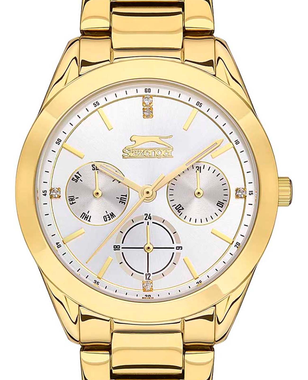 Женские наручные часы Slazenger SL.09.2032.4.03 сочетают в себе элегантность и функциональность для современных женщин. Модель обладает круглым корпусом диаметром 35 мм, изготовленным из суперметалла с IP-покрытиемIP-покрытиеМетод ионного напыления. Демонстрирует повышенную устойчивость к истиранию, окислению и химическим веществам. Под воздействием высокого давления и температуры около 1500°C молекулы металла надёжно соединяются с частицами корпуса часов., что придает изделию роскошный внешний вид и обеспечивает защиту от царапин. Золотистый тон корпуса гармонирует с серебристым циферблатом, украшенным логотипом бренда и выполненном по технологии Sunray (солнечные лучи), создающей игру света и глубины. Часы комплектуются браслетом из суперметалла с IP-покрытиемIP-покрытиеМетод ионного напыления. Демонстрирует повышенную устойчивость к истиранию, окислению и химическим веществам. Под воздействием высокого давления и температуры около 1500°C молекулы металла надёжно соединяются с частицами корпуса часов., который надежно фиксируется благодаря раскладной застежкеРаскладной замокДанный вариант застежки используется только на часах с металлическим браслетом. Отличительная особенность такого крепления в том, что длина браслета становится универсальной и вы можете самостоятельно отрегулировать нужный вам размер – застежка просто двигается по браслету часов.. Для защиты используется минеральное стеклоМинеральное стеклоМинеральное стекло представляет собой искусственно выращенный минерал кварца. Такое стекло отличается особой устойчивостью к повреждениям и царапинам. Уступает по некоторым качествам сапфировому стеклу., обеспечивающее прочную защиту от повреждений. Механизм часов кварцевый, что гарантирует высокую точность хода без необходимости подзаводки. На малых циферблатах отображаются дата, день недели и текущее время в 24-часовом формате, что делает модель не только стильным аксессуаром, но и практичным инструментом для ежедневного использования. Водонепроницаемость часов достигает класса WR30, что позволяет использовать их в условиях легкого контакта с водой, например, во время мытья рук или попадания брызг, однако не рекомендуется для плавания или дайвинга. Стильные женские часы Slazenger SL.09.2032.4.03 станут идеальным дополнением как для повседневного образа, так и для деловых встреч или торжественных мероприятий.