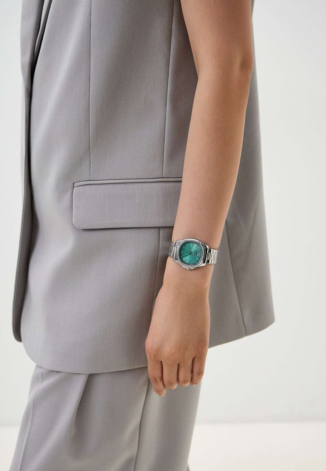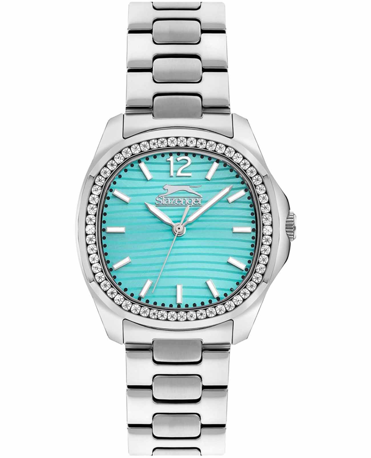 Часы Slazenger SL.09.2238.3.07 – это изысканный аксессуар, который станет стильным акцентом любого образа. Модель оснащена надежным кварцевым механизмом. Корпус из прочного металла размером 34х34 мм украшен россыпью сверкающих фианитов по безелюБезельВнешний ободок, закрепляющий стекло. В спортивных часах так называется поворотное кольцо с делениями на циферблате, выполняет роль таймера – замеряет отрезки времени на шкале. Неподвижный безель – элемент декора. Однонаправленно вращающийся безель на дайверских часах позволяет фиксировать моменты погружения и выныривания на поверхность., что придает часам особое сияние и элегантность. Голубой циферблат с логотипом бренда защищен стойким к царапинам минеральным стекломМинеральное стеклоМинеральное стекло представляет собой искусственно выращенный минерал кварца. Такое стекло отличается особой устойчивостью к повреждениям и царапинам. Уступает по некоторым качествам сапфировому стеклу.. Четкие часовые метки в виде лаконичных штрихов и крупная арабская цифра 12 обеспечивают удобство чтения времени. Заводная головка с рифлением дополнена защитой для повышения долговечности. Металлический браслет шириной 18 мм надежно фиксируется на запястье с помощью застежки «бабочка»Застёжка "бабочка"Такой вид застёжки дополняется предохранителями, помогающими избежать случайного раскрытия браслета. Обладают изящным исполнением. . Для удобства использования в темное время суток предусмотрено люминесцентное покрытиеЛюминесцентное покрытиеПозволяет считывать показания времени в темноте. Производители наносят на стрелки, часовые индексы, безель или поверхность циферблата светонакопительный состав, дающий холодное свечение. стрелок. Водозащита 30WR позволяет не беспокоиться о случайных брызгах. Вес изделия составляет 92 грамма, что делает часы комфортными для ежедневного ношения. Эти часы идеально подойдут для тех, кто ценит гармонию стиля, качества и функциональности.