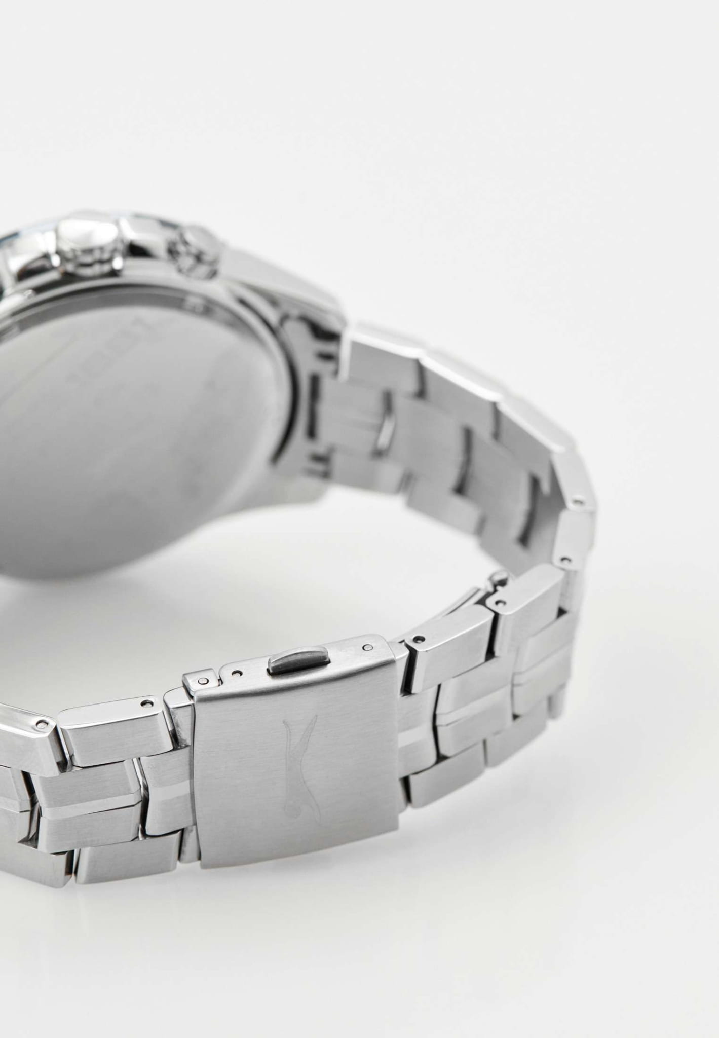 Часы Slazenger SL.09.2259.2.03 — это стильный и многофункциональный аксессуар, который станет достойным дополнением к вашему образу. Корпус и браслет модели выполнены из современного суперметалла — прочного сплава на основе меди с пониженным содержанием цинка и никеля, а также инновационным покрытием, что обеспечивает долговечность и привлекательный внешний вид. На безельБезельВнешний ободок, закрепляющий стекло. В спортивных часах так называется поворотное кольцо с делениями на циферблате, выполняет роль таймера – замеряет отрезки времени на шкале. Неподвижный безель – элемент декора. Однонаправленно вращающийся безель на дайверских часах позволяет фиксировать моменты погружения и выныривания на поверхность. нанесено синее IP-покрытиеIP-покрытиеМетод ионного напыления. Демонстрирует повышенную устойчивость к истиранию, окислению и химическим веществам. Под воздействием высокого давления и температуры около 1500°C молекулы металла надёжно соединяются с частицами корпуса часов., что придает аксессуару утончённый и универсальный внешний вид. Под минеральным стекломМинеральное стеклоМинеральное стекло представляет собой искусственно выращенный минерал кварца. Такое стекло отличается особой устойчивостью к повреждениям и царапинам. Уступает по некоторым качествам сапфировому стеклу. находится серебристый циферблат с дополнительными функциями: вынесенный 24-часовой индикатор, указатель дня недели, окно даты в положении между 4 и 5 часами, а также функция GMTGMTОтображение времени второго часового пояса.Такая функция особенно актуальна для путешественников и бизнесменов,которые общаются с людьми из разных стран,теперь вы всегда будете знать,какой час у вашего партнёра или близкого человека. для отслеживания второго часового поясаВторой часовой поясФункция, позволяющая отображать время двух часовых поясов одновременно. — всё это делает модель особенно удобной при активном образе жизни и путешествиях. Кварцевый механизм гарантирует высокую точность хода. Диаметр корпуса составляет 46 мм, толщина — 12 мм, что подчёркивает современный характер часов. Стрелки с люминесцентным покрытиемЛюминесцентное покрытиеПозволяет считывать показания времени в темноте. Производители наносят на стрелки, часовые индексы, безель или поверхность циферблата светонакопительный состав, дающий холодное свечение. удобно подсвечиваются в темноте после зарядки на свету. Стальной браслет с раскладной застёжкойРаскладная застёжкаТакой тип застёжки используется только на браслетах из металла. Она никогда не раскрывается полностью, происходит разделение на 2 и более частей. Раскладывающая застёжка снизит вероятность потери часов к минимуму. обеспечивает комфортную посадку. Водозащита до 5 атмосфер позволяет не опасаться случайных брызг или дождя. Часы идеально подходят для ежедневного ношения и особых случаев, а также станут отличным подарком.