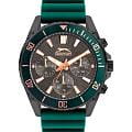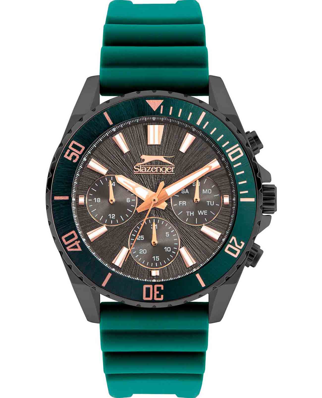 Часы Slazenger SL.09.2274.2.03 сочетают в себе современный стиль и надежность. Круглый корпус диаметром 44 мм выполнен из суперметалла с черным IP-покрытиемIP-покрытиеМетод ионного напыления. Демонстрирует повышенную устойчивость к истиранию, окислению и химическим веществам. Под воздействием высокого давления и температуры около 1500°C молекулы металла надёжно соединяются с частицами корпуса часов., что придает модели выразительный и элегантный вид. Черный циферблат с логотипом бренда защищен прочным минеральным стекломМинеральное стеклоМинеральное стекло представляет собой искусственно выращенный минерал кварца. Такое стекло отличается особой устойчивостью к повреждениям и царапинам. Уступает по некоторым качествам сапфировому стеклу., рифленый сатинированный безельБезельВнешний ободок, закрепляющий стекло. В спортивных часах так называется поворотное кольцо с делениями на циферблате, выполняет роль таймера – замеряет отрезки времени на шкале. Неподвижный безель – элемент декора. Однонаправленно вращающийся безель на дайверских часах позволяет фиксировать моменты погружения и выныривания на поверхность. с зеленым IP-покрытиемIP-покрытиеМетод ионного напыления. Демонстрирует повышенную устойчивость к истиранию, окислению и химическим веществам. Под воздействием высокого давления и температуры около 1500°C молекулы металла надёжно соединяются с частицами корпуса часов. украшен минутными отметками. На дополнительных циферблатах отображаются дата, день недели и время в 12- и 24-часовом формате. Надежный кварцевый механизм обеспечивает точность хода. Силиконовый зеленый ремешок шириной 22 мм удобно фиксируется на запястье с помощью классической застежки. Стрелки и метки с люминесцентным покрытиемЛюминесцентное покрытиеПозволяет считывать показания времени в темноте. Производители наносят на стрелки, часовые индексы, безель или поверхность циферблата светонакопительный состав, дающий холодное свечение. удобно подсвечиваются в темноте после зарядки на свету. Водозащита 50WR позволяет использовать часы в повседневной жизни, а вес 90 г и толщина корпуса 12 мм делают их комфортными для ежедневного ношения.