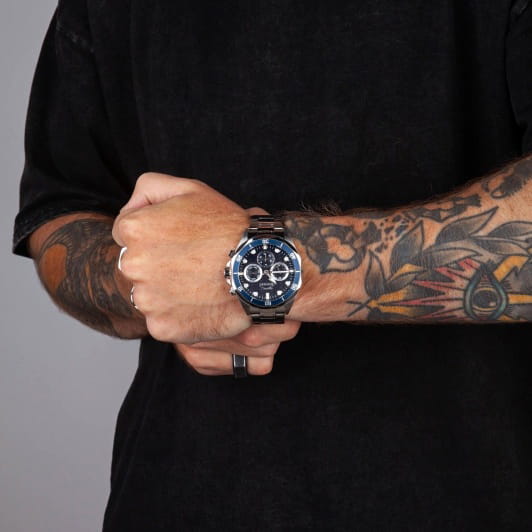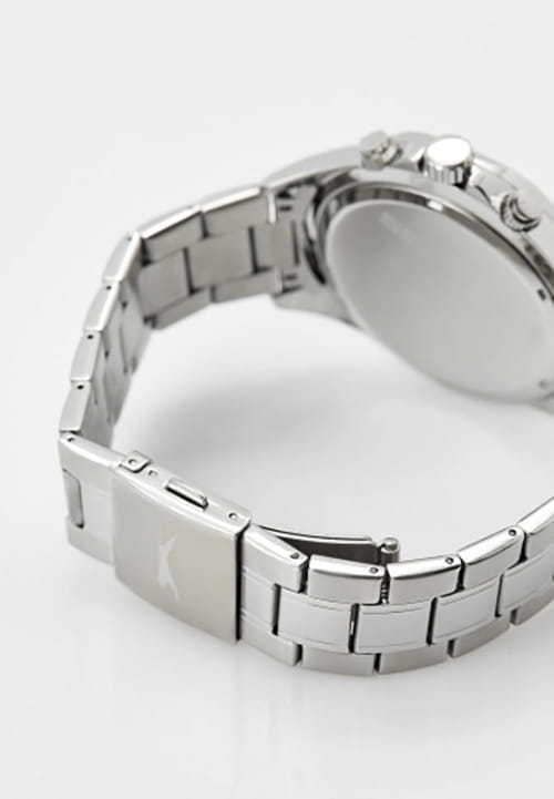 Мужские кварцевые часы Slazenger SL.09.2309.2.03 — это выразительный и функциональный аксессуар, сочетающий прочность, стиль и насыщенную комплектацию. Корпус и браслет выполнены из суперметалла, защищён минеральным стекломМинеральное стеклоМинеральное стекло представляет собой искусственно выращенный минерал кварца. Такое стекло отличается особой устойчивостью к повреждениям и царапинам. Уступает по некоторым качествам сапфировому стеклу.. Циферблат синего цвета оформлен с вынесенными малыми циферблатами для индикации дня недели, даты и времени в 24-часовом формате. Стрелки и метки оснащены люминесцентным покрытиемЛюминесцентное покрытиеПозволяет считывать показания времени в темноте. Производители наносят на стрелки, часовые индексы, безель или поверхность циферблата светонакопительный состав, дающий холодное свечение., обеспечивающим хорошую читаемость в темноте. Заводная головка снабжена защитой, а задняя крышка — завинчивающаяся, что повышает надёжность конструкции. Браслет фиксируется на раскладной застёжкеРаскладная застёжкаТакой тип застёжки используется только на браслетах из металла. Она никогда не раскрывается полностью, происходит разделение на 2 и более частей. Раскладывающая застёжка снизит вероятность потери часов к минимуму., обеспечивая удобство и безопасность ношения. Водонепроницаемость 50 м позволяет использовать часы в повседневных условиях, защищая от случайных брызг и капель дождя. Модель подчёркивает индивидуальность владельца и идеально подходит как для повседневного, так и для делового образа.