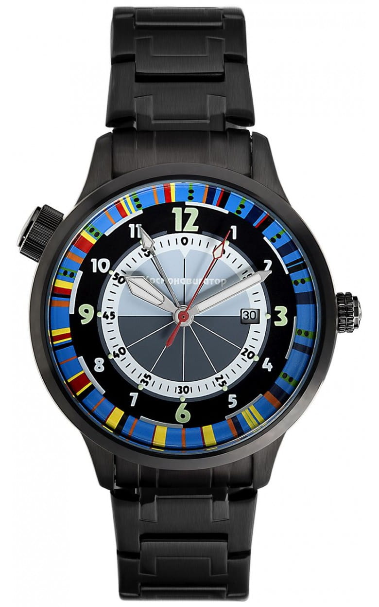 Часы Спецназ "Космонавигатор" С9124153-6М17 — уникальная модель, разработанная лётчиком-космонавтом Владимиром Джанибековым. Корпус диаметром 44 мм выполнен из нержавеющей стали с PVD-покрытиемPVDУльтратонкое покрытие наносится в технике вакуумного напыления, сочетает в себе нитрид титана особой прочности со слоем золота или оксида хрома. Несёт в себе декоративную или защитную функцию. чёрного цвета, а комбинированный циферблат защищён минеральным стекломМинеральное стеклоМинеральное стекло представляет собой искусственно выращенный минерал кварца. Такое стекло отличается особой устойчивостью к повреждениям и царапинам. Уступает по некоторым качествам сапфировому стеклу..