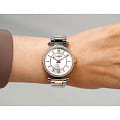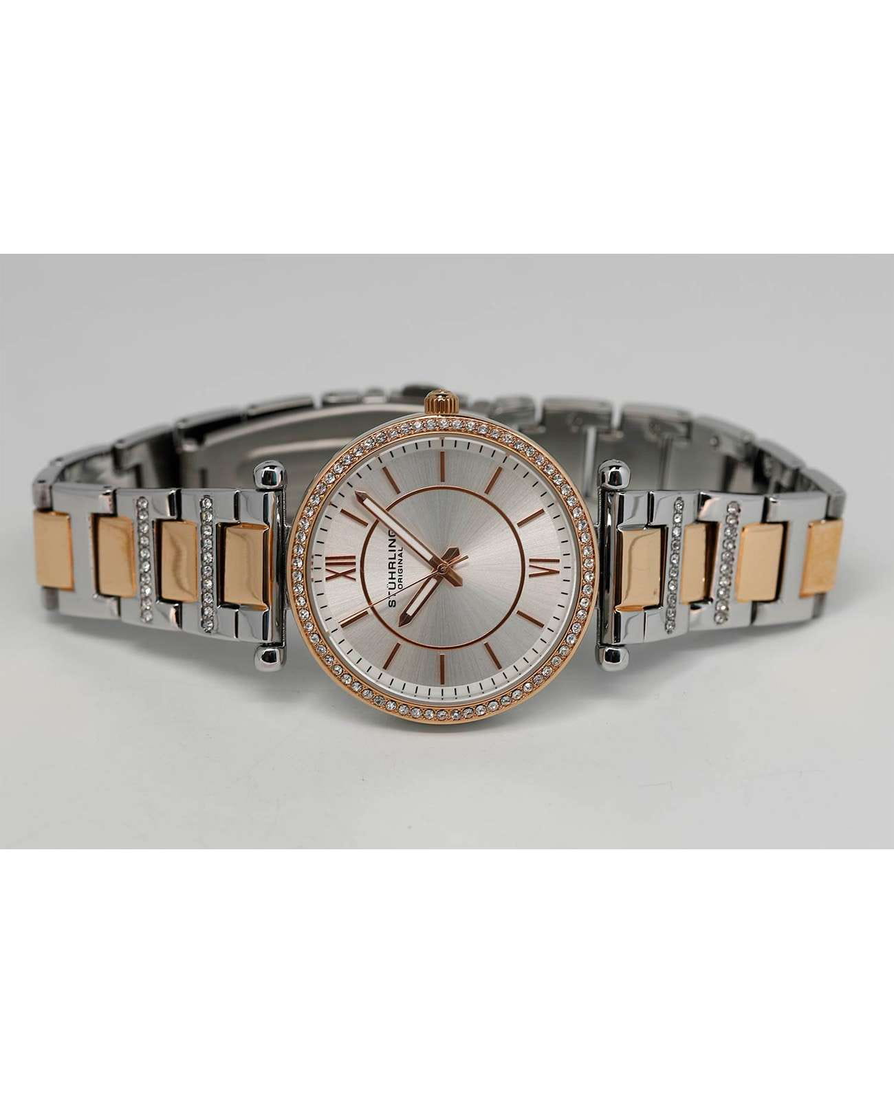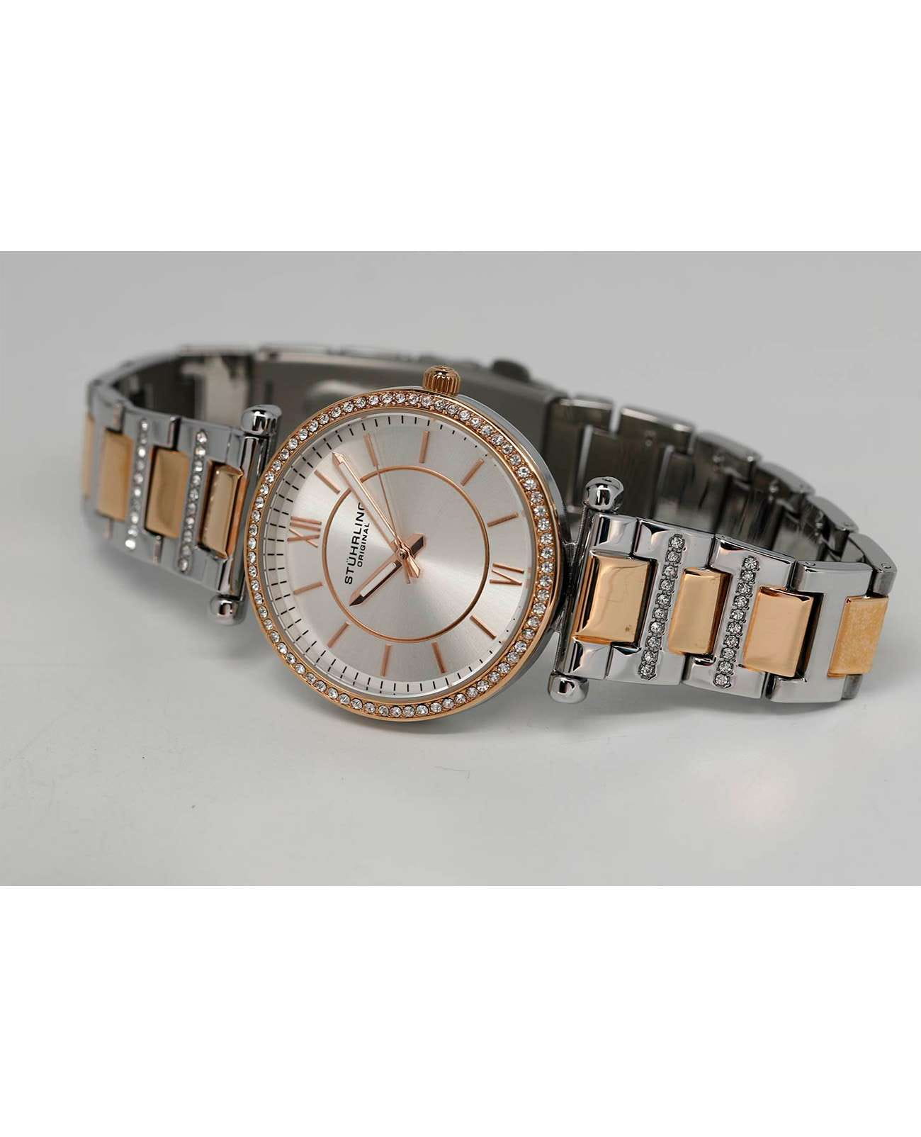 Женские наручные часы Stuhrling 3905.3 из коллекции Aria сочетают в себе элегантный дизайн и функциональность. Модель обладает круглым корпусом диаметром 36,0 мм, изготовленным из нержавеющей стали, что обеспечивает прочность и устойчивость к внешним воздействиям. БезельБезельВнешний ободок, закрепляющий стекло. В спортивных часах так называется поворотное кольцо с делениями на циферблате, выполняет роль таймера – замеряет отрезки времени на шкале. Неподвижный безель – элемент декора. Однонаправленно вращающийся безель на дайверских часах позволяет фиксировать моменты погружения и выныривания на поверхность. с PVD-покрытиемPVDУльтратонкое покрытие наносится в технике вакуумного напыления, сочетает в себе нитрид титана особой прочности со слоем золота или оксида хрома. Несёт в себе декоративную или защитную функцию.. Браслет выполнен из стали с частичным розовым PVD-покрытиемPVDУльтратонкое покрытие наносится в технике вакуумного напыления, сочетает в себе нитрид титана особой прочности со слоем золота или оксида хрома. Несёт в себе декоративную или защитную функцию. и оснащен раскладной застежкойРаскладной замокДанный вариант застежки используется только на часах с металлическим браслетом. Отличительная особенность такого крепления в том, что длина браслета становится универсальной и вы можете самостоятельно отрегулировать нужный вам размер – застежка просто двигается по браслету часов., гарантирующей комфортное ношение . Серебристый циферблат выполнен по технологии Sunray (солнечные лучи), что придает ему особый блеск и стиль . Циферблат украшен накладными метками в виде штрихов и двух камней, подчеркивающих изысканность модели . Для защиты используется KrysternaKrysternaKrysterna — инновационное стекло для наручных часов. Благодаря уникальной структуре, Krysterna объединяет ключевые преимущества двух материалов: твердость сапфира, защищающую от царапин, и гибкость минерального стекла, обеспечивающую устойчивость к деформациям. Такая комбинация делает его идеальным решением для часов, подверженных экстремальным нагрузкам, сохраняя при этом оптическую прозрачность., обеспечивающее надежную защиту от царапин . Часы работают на кварцевом механизме, что гарантирует точное время без необходимости подзаводки. Водонепроницаемость часов составляет 30WR, что позволяет использовать их в повседневной жизни, включая контакт с водой, например, при мытье рук, но не рекомендуется для плавания или дайвинга.
