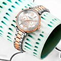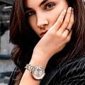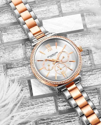 Женские наручные часы Stuhrling 3908.3 сочетают в себе элегантный дизайн и функциональность. Модель обладает круглым корпусом диаметром 40,0 мм, изготовленным из стали с розовым PVD-покрытиемPVDУльтратонкое покрытие наносится в технике вакуумного напыления, сочетает в себе нитрид титана особой прочности со слоем золота или оксида хрома. Несёт в себе декоративную или защитную функцию., что обеспечивает прочность и устойчивость к внешним воздействиям . Толщина корпуса составляет 8,5 мм, что делает часы достаточно компактными для повседневного использования . Браслет из того же материала с частичным PVD-покрытиемPVDУльтратонкое покрытие наносится в технике вакуумного напыления, сочетает в себе нитрид титана особой прочности со слоем золота или оксида хрома. Несёт в себе декоративную или защитную функцию. на раскладной застёжкеРаскладная застёжкаТакой тип застёжки используется только на браслетах из металла. Она никогда не раскрывается полностью, происходит разделение на 2 и более частей. Раскладывающая застёжка снизит вероятность потери часов к минимуму.. Серебристый циферблат украшен римскими цифрами и накладными метками, подчеркивающими классический стиль модели . Для защиты используется стекло KrysternaKrysternaKrysterna — инновационное стекло для наручных часов. Благодаря уникальной структуре, Krysterna объединяет ключевые преимущества двух материалов: твердость сапфира, защищающую от царапин, и гибкость минерального стекла, обеспечивающую устойчивость к деформациям. Такая комбинация делает его идеальным решением для часов, подверженных экстремальным нагрузкам, сохраняя при этом оптическую прозрачность., обеспечивающее повышенную устойчивость к царапинам и надежную защиту циферблата. Часы работают на кварцевом механизме, что гарантирует точное время без необходимости подзаводки . Водонепроницаемость часов составляет 30WR, что позволяет использовать их в повседневной жизни, включая контакт с водой, например, при мытье рук, но не рекомендуется для плавания или дайвинга.