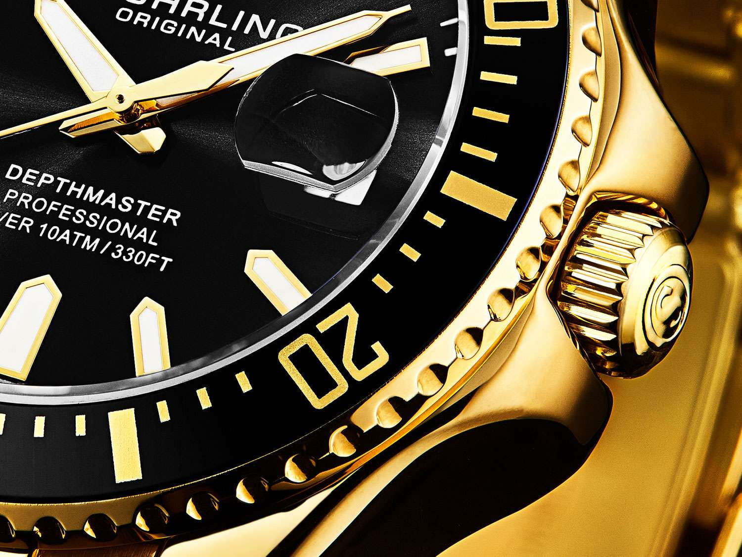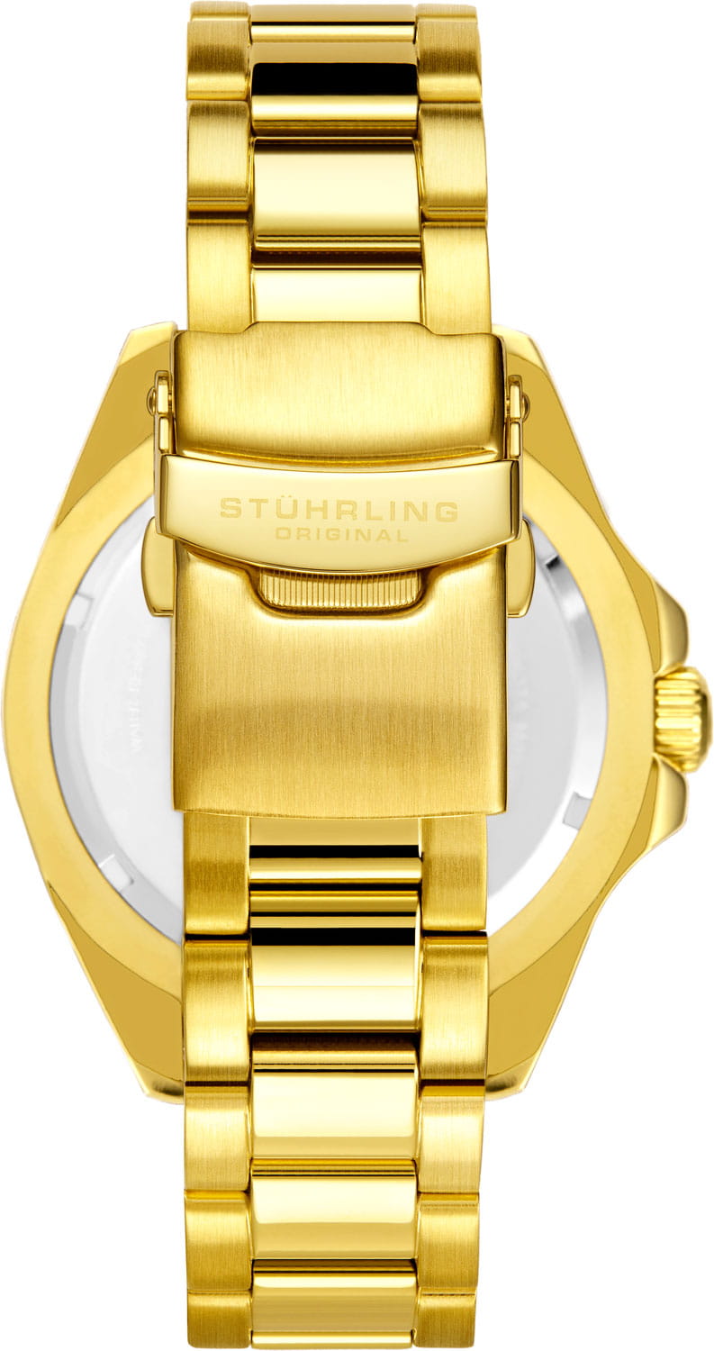 Stuhrling 3950A.7 — стильные мужские часы в духе морского дайверского дизайна. Глубокий циферблат с радиальным переливом и крупные метки/стрелки с люминесцентным покрытиемЛюминесцентное покрытиеПозволяет считывать показания времени в темноте. Производители наносят на стрелки, часовые индексы, безель или поверхность циферблата светонакопительный состав, дающий холодное свечение. обеспечивают отличную читаемость, вращающийся безельБезельВнешний ободок, закрепляющий стекло. В спортивных часах так называется поворотное кольцо с делениями на циферблате, выполняет роль таймера – замеряет отрезки времени на шкале. Неподвижный безель – элемент декора. Однонаправленно вращающийся безель на дайверских часах позволяет фиксировать моменты погружения и выныривания на поверхность. с PVD-покрытиемPVDУльтратонкое покрытие наносится в технике вакуумного напыления, сочетает в себе нитрид титана особой прочности со слоем золота или оксида хрома. Несёт в себе декоративную или защитную функцию. подчёркивает спортивный характер. Корпус и браслет с PVD-покрытиемPVDУльтратонкое покрытие наносится в технике вакуумного напыления, сочетает в себе нитрид титана особой прочности со слоем золота или оксида хрома. Несёт в себе декоративную или защитную функцию. из нержавеющей стали, удобная раскладная застёжкаРаскладная застёжкаТакой тип застёжки используется только на браслетах из металла. Она никогда не раскрывается полностью, происходит разделение на 2 и более частей. Раскладывающая застёжка снизит вероятность потери часов к минимуму. фиксирует часы на запястье. Циферблат прикрыт стеклом Krysterna с высокой стойкостью к царапинам. Надёжный спутник для повседневной настроения и активного отдыха.