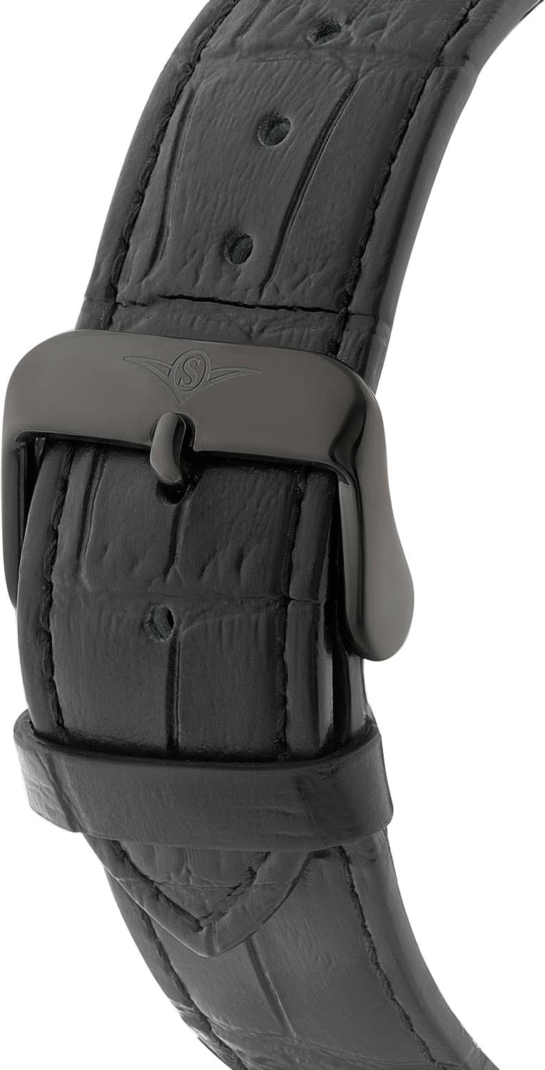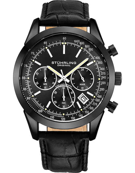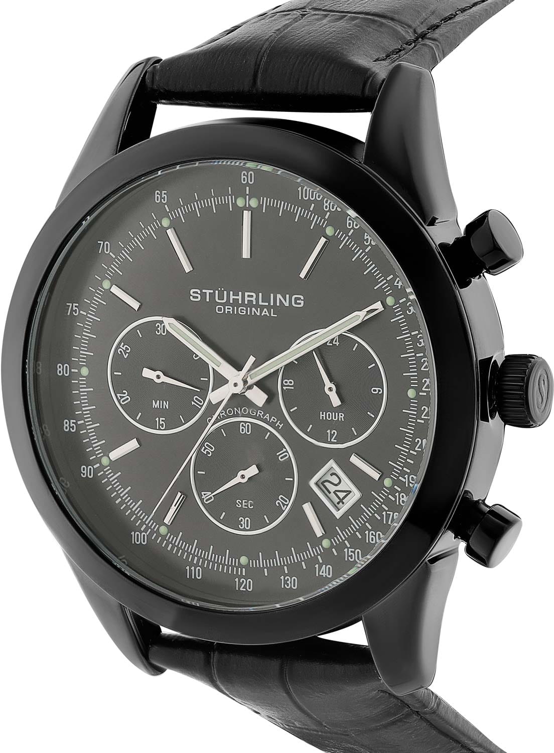 Stuhrling 3975L.3 — стильные мужские часы с выразительным пилотским дизайном и мощным функционалом. Классический циферблат дополнен контрастными счётчиками хронографаХронографФункция позволяет измерять отрезки времени с особой точностью: часы, минуты, секунды. Верным признаком хронографа является наличие на циферблате 3 дополнительных окошек-счётчиков., тахиметрической шкалой по ободу и аккуратным окошком даты, подчёркивающими технический характер модели. Корпус из нержавеющей стали с PVD-покрытиемPVDУльтратонкое покрытие наносится в технике вакуумного напыления, сочетает в себе нитрид титана особой прочности со слоем золота или оксида хрома. Несёт в себе декоративную или защитную функцию. придаёт часам надёжность и современный блеск, а стекло KrysternaKrysternaKrysterna — инновационное стекло для наручных часов. Благодаря уникальной структуре, Krysterna объединяет ключевые преимущества двух материалов: твердость сапфира, защищающую от царапин, и гибкость минерального стекла, обеспечивающую устойчивость к деформациям. Такая комбинация делает его идеальным решением для часов, подверженных экстремальным нагрузкам, сохраняя при этом оптическую прозрачность. защищает поверхность от царапин и сохраняет кристальную прозрачность. Кожаный ремень с классической текстурой аллигатора и стандартной застежкой, обеспечивает комфорт и элегантную посадку на запястье. Stuhrling — гармония силы, точности и изысканного стиля для мужчин, ценящих уверенность и безупречный вкус.