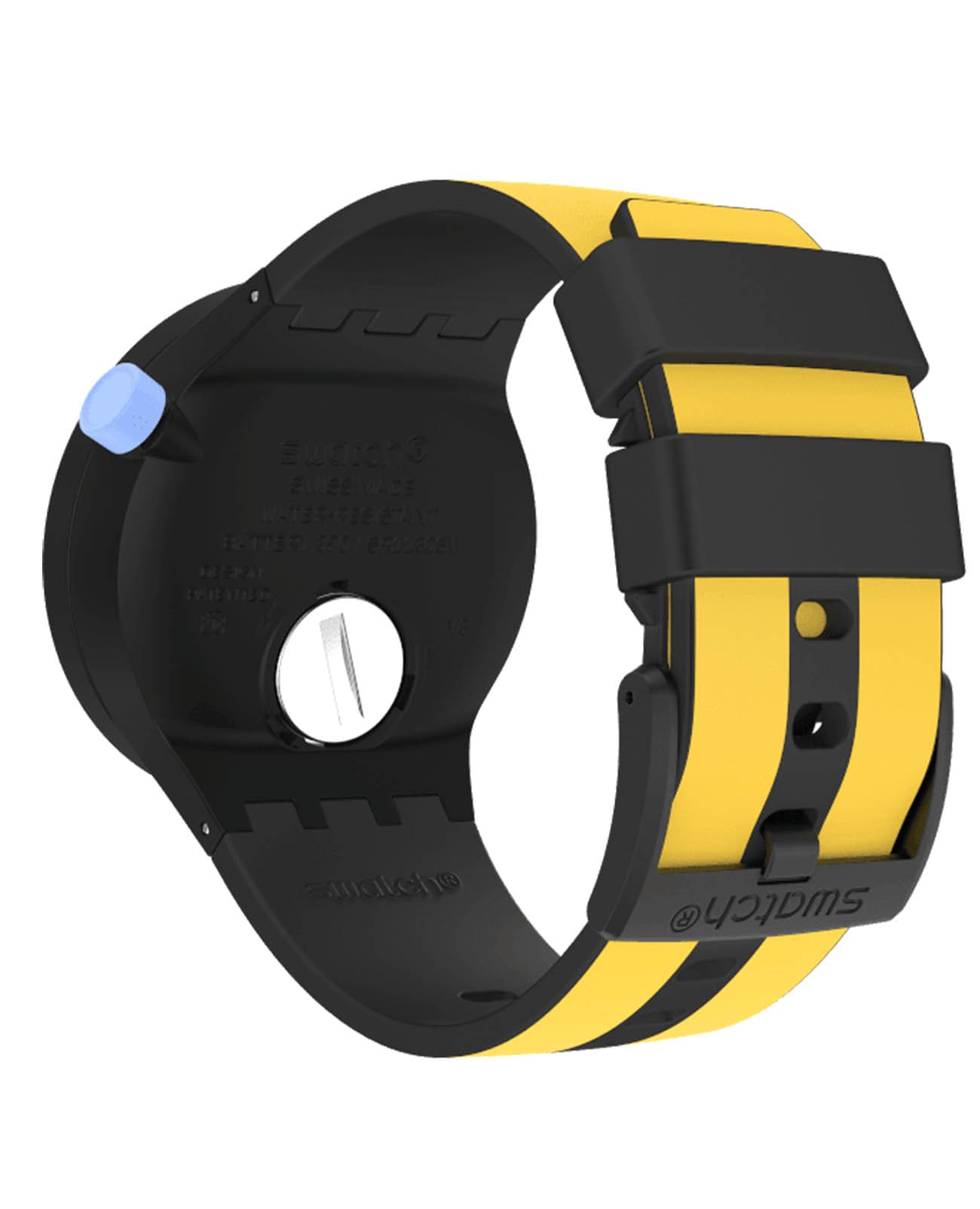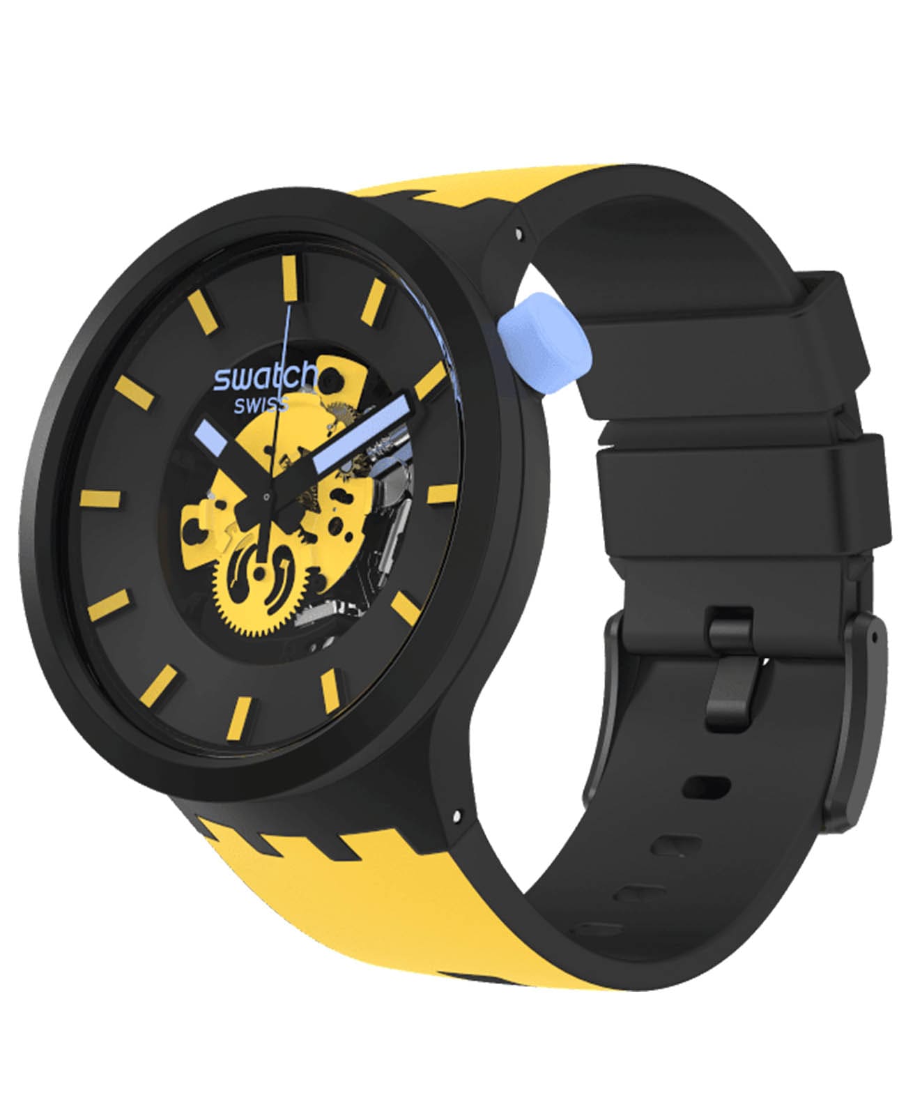 Часы Swatch SB03B109 — это стильный и современный аксессуар для тех, кто ценит лёгкость и комфорт. Часы идеально подойдут как для мужчин, так и для женщин. Центральный элемент этой модели часов — большой корпус со стеклом из био-материала, украшенный 3D-циферблатом с принтами на индексах. Корпус из биокерамикиБиокерамикаБиокерамика — это материал, который на две трети состоит из керамики, на одну треть — из биопластика. Он сочетает в себе лучшие качества обоих материалов и обладает прочностью и шелковистой на ощупь текстурой., а также силиконовые тренчики подчеркивают желтый принт на силиконовом ремешке этих огромных часов. На часовую, минутную стрелки нанесено люминесцентное покрытиеЛюминесцентное покрытиеПозволяет считывать показания времени в темноте. Производители наносят на стрелки, часовые индексы, безель или поверхность циферблата светонакопительный состав, дающий холодное свечение., которое светится в темноте, создавая необычное изображение. Водозащита 30 метров делает часы практичными для повседневного использования. Эти часы подойдут для повседневного ношения и станут ярким акцентом в вашем наряде.