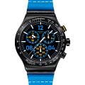 Мужские наручные часы-хронографХронографФункция позволяет измерять отрезки времени с особой точностью: часы, минуты, секунды. Верным признаком хронографа является наличие на циферблате 3 дополнительных окошек-счётчиков. Swatch MOMENTS IN BLUE YVB100 — это стильный и современный аксессуар для тех, кто ценит лёгкость и комфорт. Корпус выполнен из нержавеющей стали с PVD-покрытиемPVDУльтратонкое покрытие наносится в технике вакуумного напыления, сочетает в себе нитрид титана особой прочности со слоем золота или оксида хрома. Несёт в себе декоративную или защитную функцию. черного цвета, диаметром 43 мм и толщиной 12.67 мм, что обеспечивает долговечность и утончённый внешний вид. Циферблат защищён минеральным стекломМинеральное стеклоМинеральное стекло представляет собой искусственно выращенный минерал кварца. Такое стекло отличается особой устойчивостью к повреждениям и царапинам. Уступает по некоторым качествам сапфировому стеклу., устойчивым к повреждениям. Модель оснащена кварцевым механизмом, обеспечивающим высокую точность хода. Шкала тахиметраТахиметрРазмеченная шкала, располагается на ободке или безеле часов. Тахиметр позволяет рассчитать скорость на определённом участке пути, расстояние измеряется в километрах или милях. на безелеБезельВнешний ободок, закрепляющий стекло. В спортивных часах так называется поворотное кольцо с делениями на циферблате, выполняет роль таймера – замеряет отрезки времени на шкале. Неподвижный безель – элемент декора. Однонаправленно вращающийся безель на дайверских часах позволяет фиксировать моменты погружения и выныривания на поверхность.. Стрелки и метки с люминесцентным покрытиемЛюминесцентное покрытиеПозволяет считывать показания времени в темноте. Производители наносят на стрелки, часовые индексы, безель или поверхность циферблата светонакопительный состав, дающий холодное свечение.. Тканевый ремешок на стандартной застёжке гармонично дополняет корпус и обеспечивает комфортное ношение. Водозащита 30 метров делает часы практичными для повседневного использования. Эти часы подойдут для повседневного ношения и станут ярким акцентом в вашем наряде.