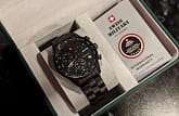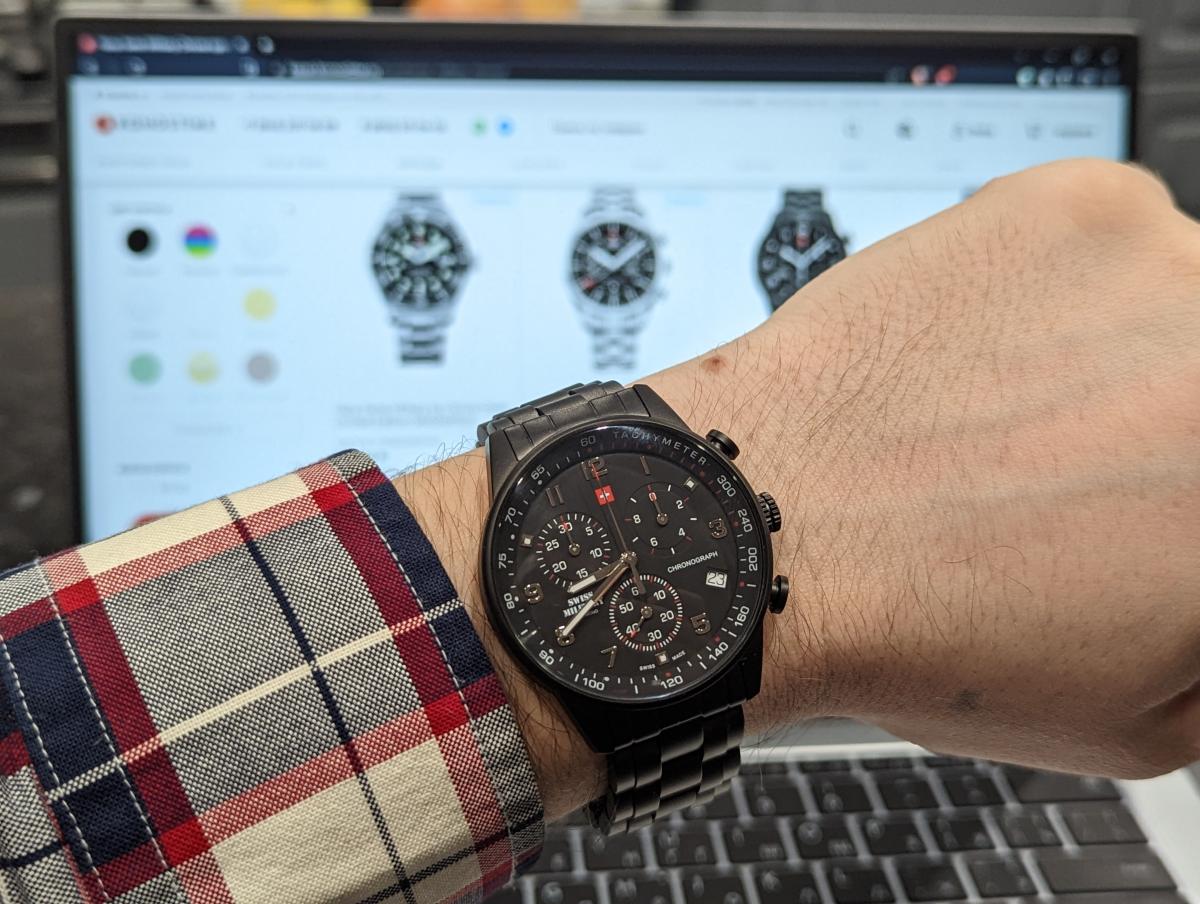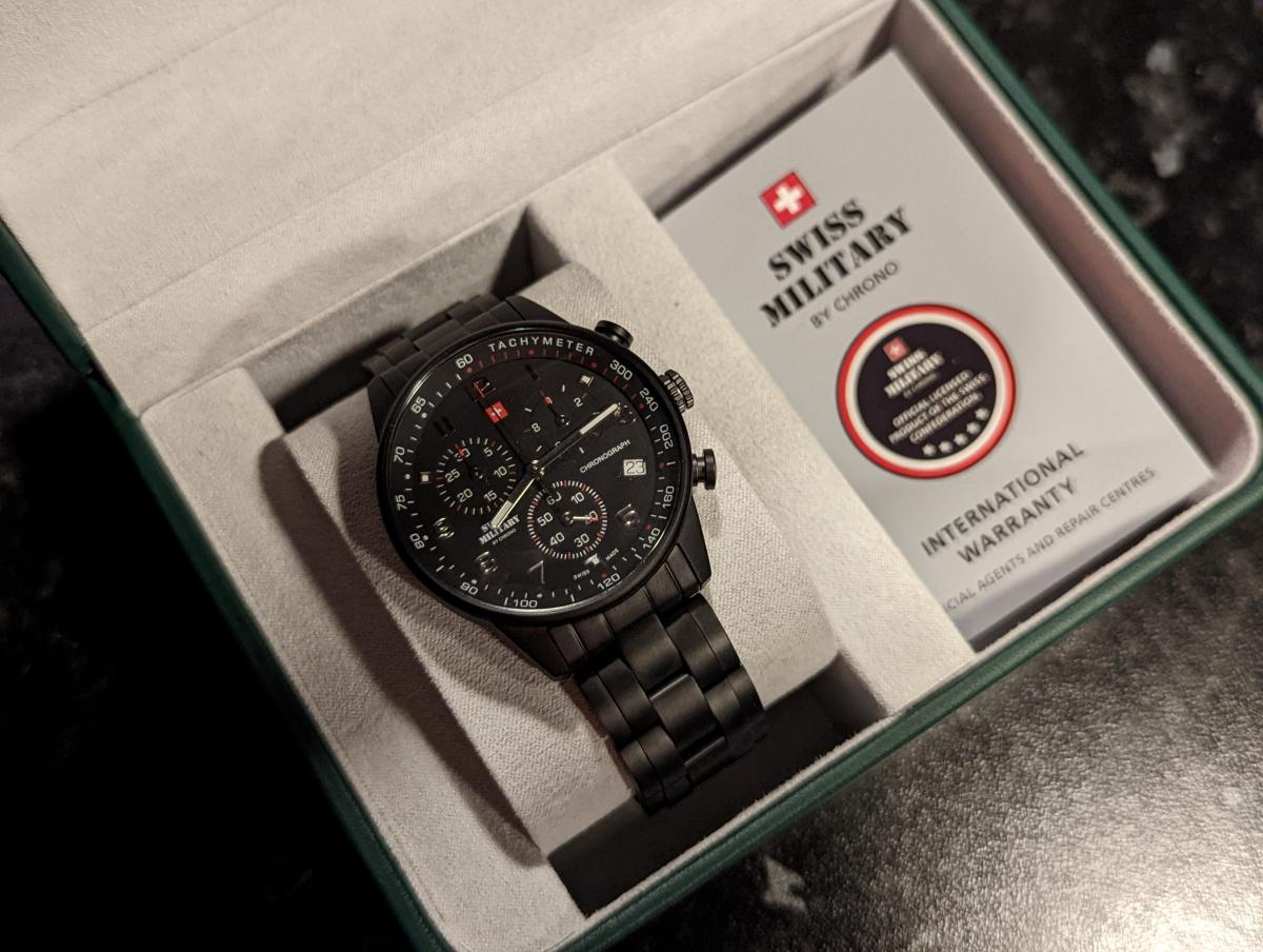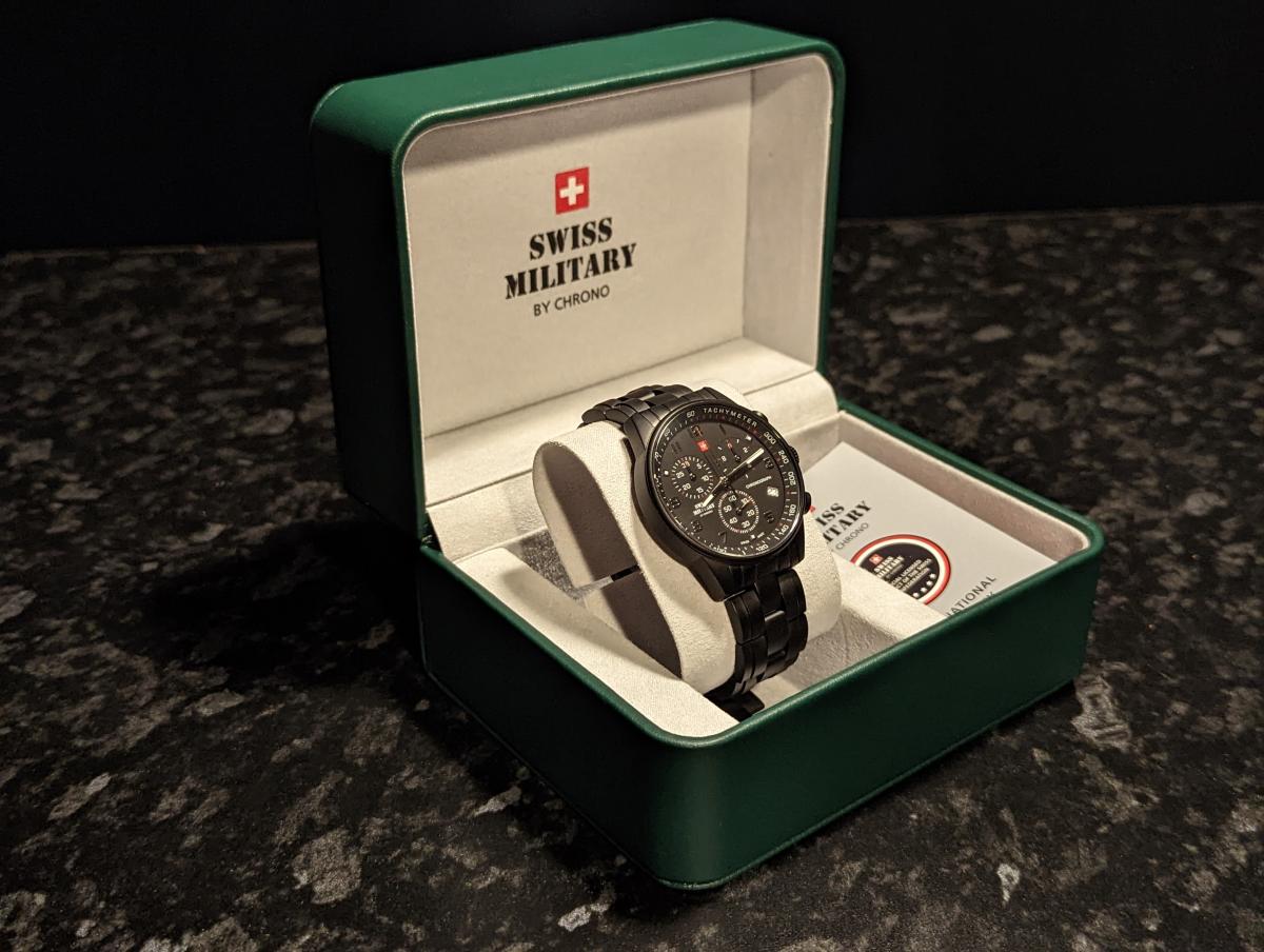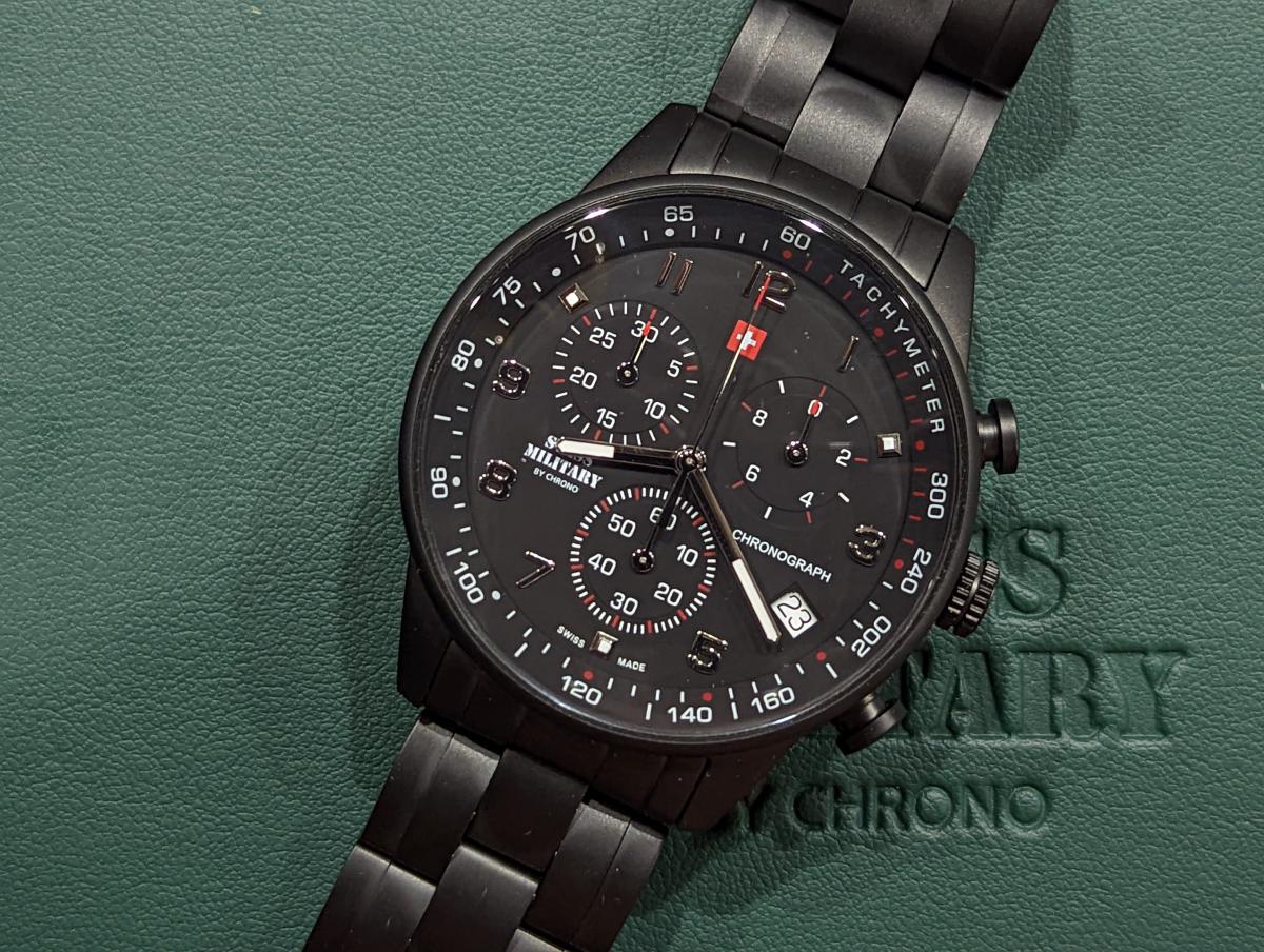Мужские швейцарские наручные часы-хронографХронографФункция позволяет измерять отрезки времени с особой точностью: часы, минуты, секунды. Верным признаком хронографа является наличие на циферблате 3 дополнительных окошек-счётчиков. с с секундомеромСекундомерСекундоме́р — прибор, способный измерять интервалы времени с точностью до долей секунды. Swiss Military by Chrono SM34012.04, кварцевый механизм с высокой точностью. Класс водозащиты: 50 метров, позволит защитить корпус от случайных брызг или капель дождя. Корпус часов изготовлен из стали с PVDPVDУльтратонкое покрытие наносится в технике вакуумного напыления, сочетает в себе нитрид титана особой прочности со слоем золота или оксида хрома. Несёт в себе декоративную или защитную функцию.покрытием, черного цвета. Раскладная застёжкаРаскладная застёжкаТакой тип застёжки используется только на браслетах из металла. Она никогда не раскрывается полностью, происходит разделение на 2 и более частей. Раскладывающая застёжка снизит вероятность потери часов к минимуму. с фиксатором. Минеральное стеклоМинеральное стеклоМинеральное стекло представляет собой искусственно выращенный минерал кварца. Такое стекло отличается особой устойчивостью к повреждениям и царапинам. Уступает по некоторым качествам сапфировому стеклу. устойчивое к износу.