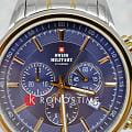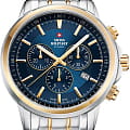 Синий циферблат с классическими индексами и стрелками дополнен люминесцентным покрытиемЛюминесцентное покрытиеПозволяет считывать показания времени в темноте. Производители наносят на стрелки, часовые индексы, безель или поверхность циферблата светонакопительный состав, дающий холодное свечение. для удобства использования в условиях низкой освещённости. Модель оснащена функцией хронографа, позволяющим измерять секунды, минуты и 1/10 секунды. Окошко даты, расположенное между 4 и 5 часами, добавляет практичности. БезельБезельВнешний ободок, закрепляющий стекло. В спортивных часах так называется поворотное кольцо с делениями на циферблате, выполняет роль таймера – замеряет отрезки времени на шкале. Неподвижный безель – элемент декора. Однонаправленно вращающийся безель на дайверских часах позволяет фиксировать моменты погружения и выныривания на поверхность. с PVD-покрытиемPVDУльтратонкое покрытие наносится в технике вакуумного напыления, сочетает в себе нитрид титана особой прочности со слоем золота или оксида хрома. Несёт в себе декоративную или защитную функцию..
