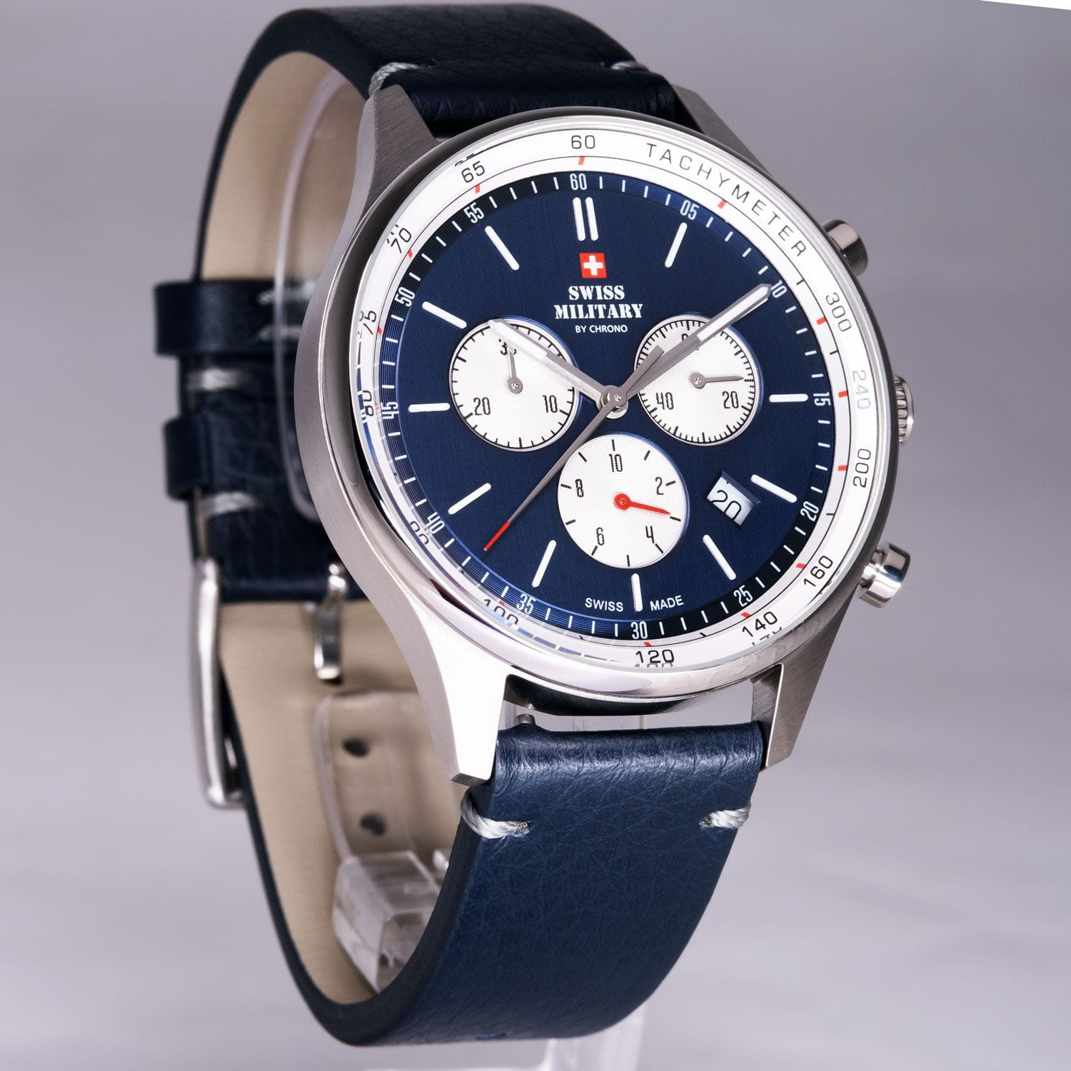Мужские швейцарские наручные часы-хронографХронографФункция позволяет измерять отрезки времени с особой точностью: часы, минуты, секунды. Верным признаком хронографа является наличие на циферблате 3 дополнительных окошек-счётчиков. Swiss Military by Chrono SM34013.08, кварцевый механизм с высокой точностью. Класс водозащиты: 100 метров, позволит плавать, нырять и заниматься другими водными видами спорта. Стрелки с люминесцентным покрытиемЛюминесцентное покрытиеПозволяет считывать показания времени в темноте. Производители наносят на стрелки, часовые индексы, безель или поверхность циферблата светонакопительный состав, дающий холодное свечение.. Корпус часов изготовлен из стали. Минеральное стеклоМинеральное стеклоМинеральное стекло представляет собой искусственно выращенный минерал кварца. Такое стекло отличается особой устойчивостью к повреждениям и царапинам. Уступает по некоторым качествам сапфировому стеклу.. Ремешок с классической застежкой.