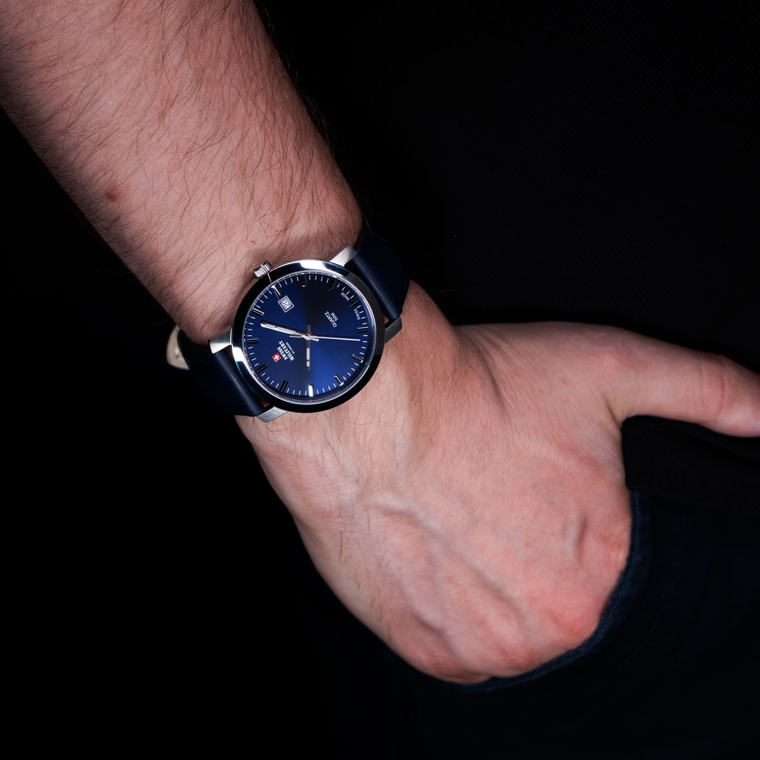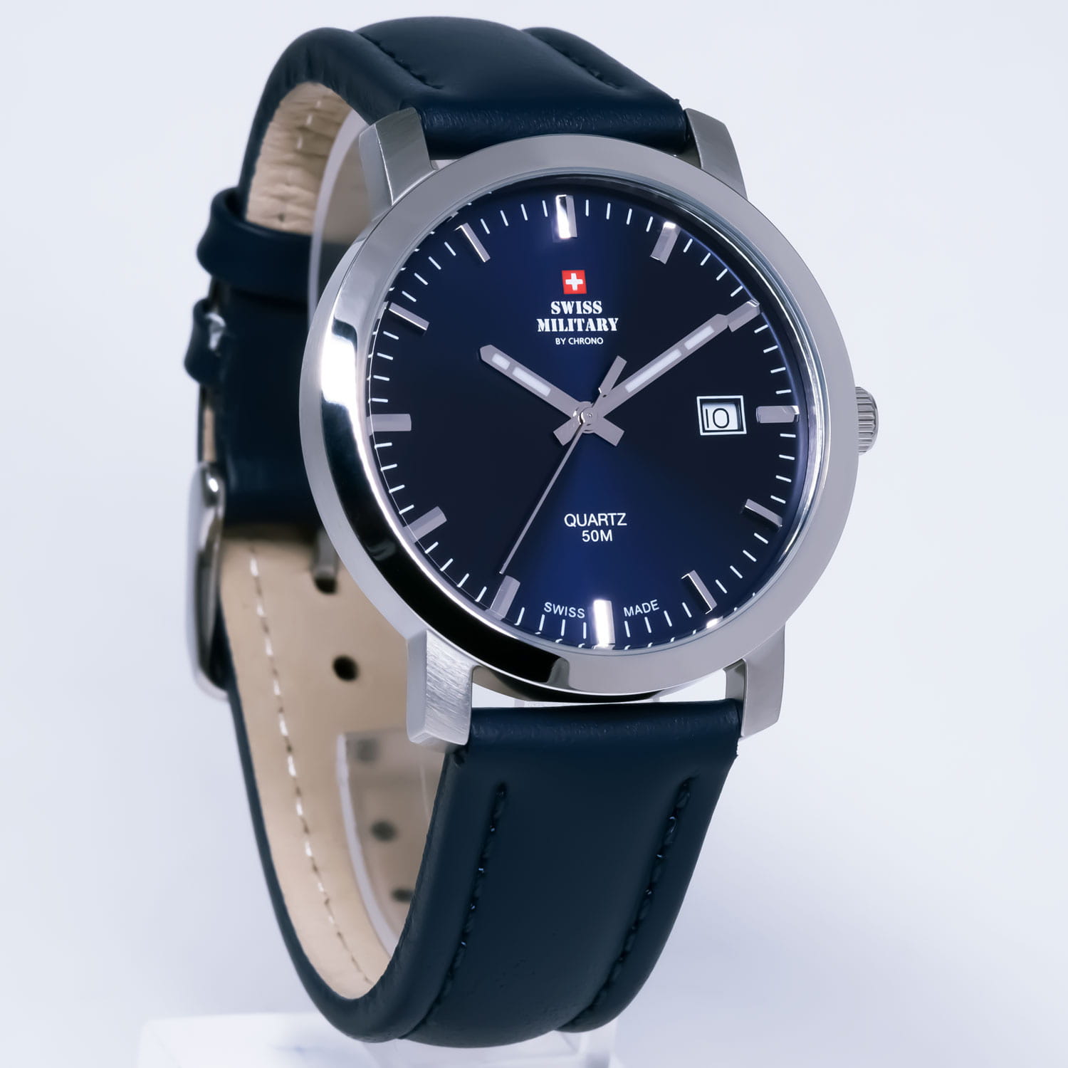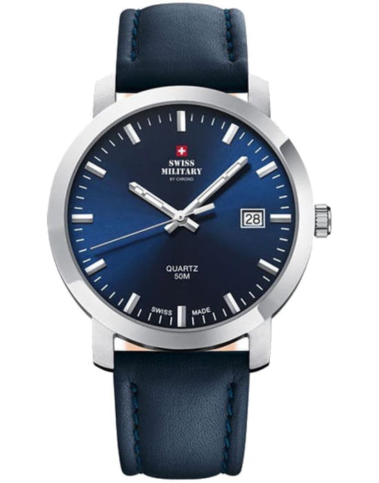 Мужские швейцарские наручные часы Swiss Military by Chrono SM34083.06, Кварцевый механизм с высокой точностью. Класс водозащиты: 50 метров, позволит защитить корпус от случайных брызг или капель дождя. Стрелки и метки с люминесцентным покрытиемЛюминесцентное покрытиеПозволяет считывать показания времени в темноте. Производители наносят на стрелки, часовые индексы, безель или поверхность циферблата светонакопительный состав, дающий холодное свечение.. Корпус выполнен из нержавеющей стали. Устойчивое к возникновению царапин минеральное стеклоМинеральное стеклоМинеральное стекло представляет собой искусственно выращенный минерал кварца. Такое стекло отличается особой устойчивостью к повреждениям и царапинам. Уступает по некоторым качествам сапфировому стеклу.. Кожаный ремешок синего цвета.
