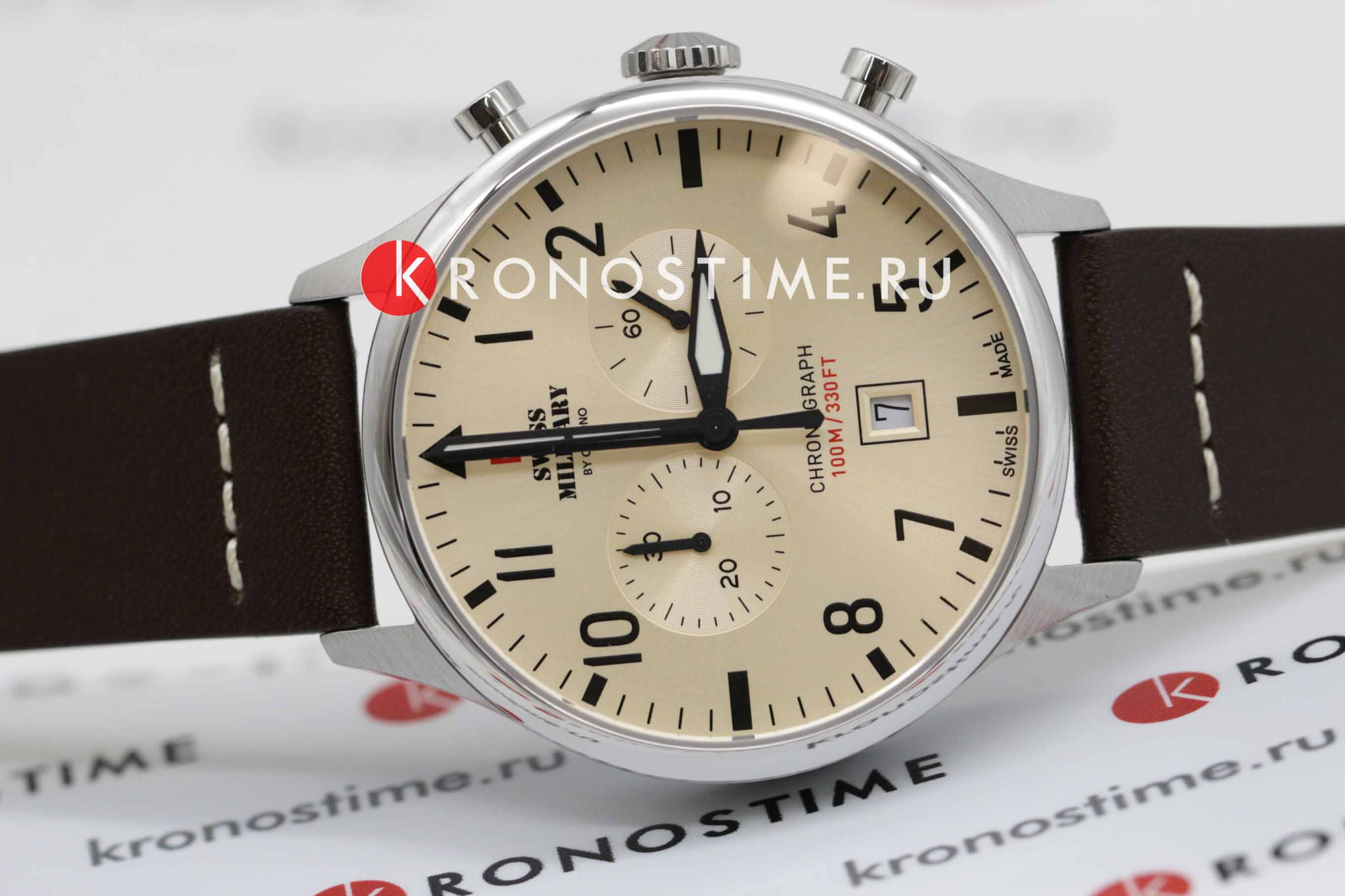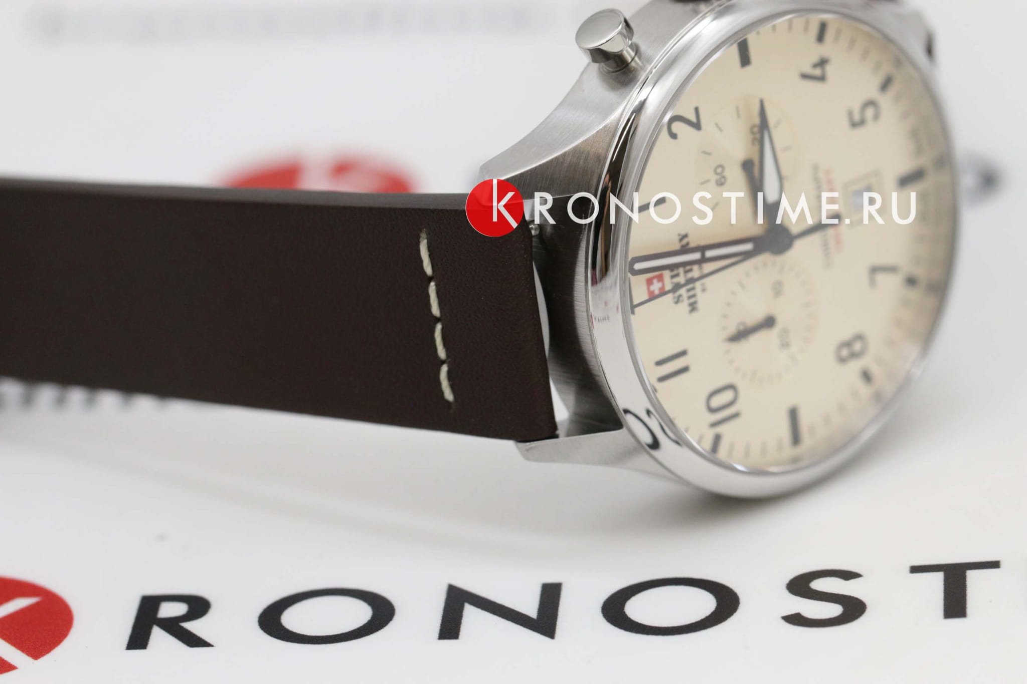 Мужские швейцарские часы хронографХронографФункция позволяет измерять отрезки времени с особой точностью: часы, минуты, секунды. Верным признаком хронографа является наличие на циферблате 3 дополнительных окошек-счётчиков. с секундомеромСекундомерСекундоме́р — прибор, способный измерять интервалы времени с точностью до долей секунды. Swiss Military by Chrono Vintage Chronograph SM34098.09, кварцевый механизм с высокой точностью. Cапфировое стеклоСапфировое стеклоПрочный и надёжный материал из кристалла сапфира синтетического происхождения, характеризующийся особой твёрдостью и устойчивостью к царапинам и повреждениям. устойчивое к появлению царапин и обладающее высокой прозрачностью. Корпус часов изготовлен из нержавеющей стали. На циферблате расположены два дополнительных индикатора и окошко даты. Окошко даты находится в положении 6 часов. Стрелки с люминесцентным покрытиемЛюминесцентное покрытиеПозволяет считывать показания времени в темноте. Производители наносят на стрелки, часовые индексы, безель или поверхность циферблата светонакопительный состав, дающий холодное свечение.. Класс водозащиты: 100 метров, позволит плавать, нырять и заниматься другими водными видами спорта. Кожаный ремешок на стандартной застежке.