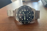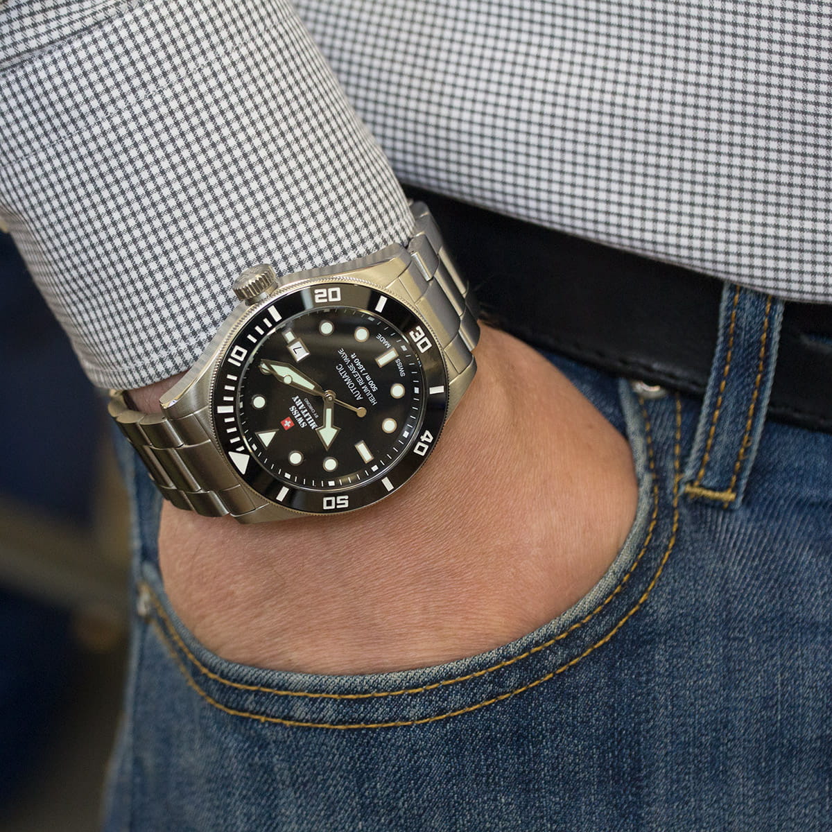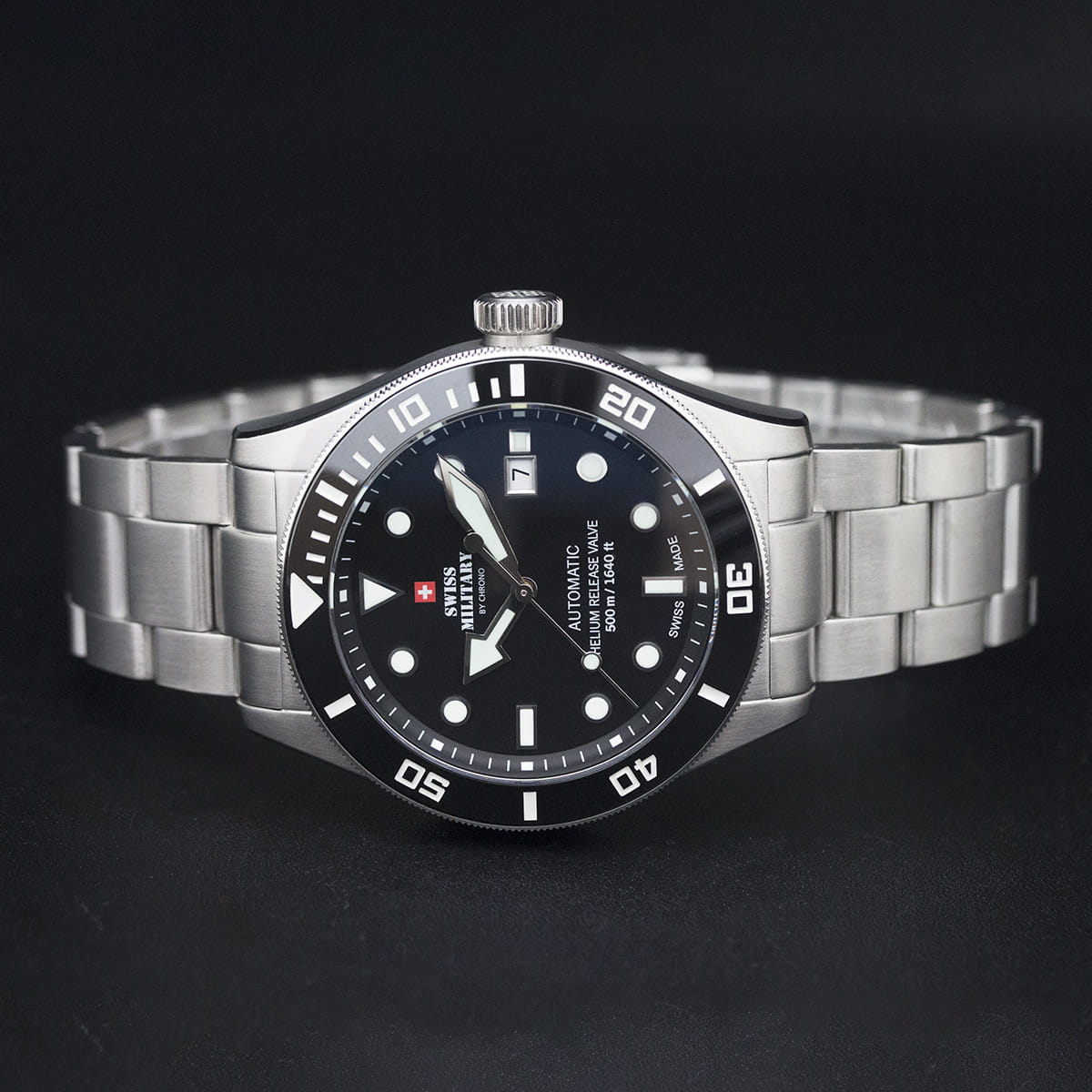 Мужские швейцарские наручные часы Swiss Military by Chrono Diver SMA34075.01, механический механизм (автоматический калибр) с высокой точностью. Сапфировое стеклоСапфировое стеклоПрочный и надёжный материал из кристалла сапфира синтетического происхождения, характеризующийся особой твёрдостью и устойчивостью к царапинам и повреждениям. устойчивое к появлению царапин, обладающее высокой прозрачностью. Водостойкость WR 500, позволяющая погружаться с аквалангом. Корпус часов изготовлен из нержавеющей стали серебристого цвета. Браслет с литыми звеньями из нержавеющей стали, раскладывающаяся застёжкаРаскладная застёжкаТакой тип застёжки используется только на браслетах из металла. Она никогда не раскрывается полностью, происходит разделение на 2 и более частей. Раскладывающая застёжка снизит вероятность потери часов к минимуму.. Циферблат в дайверском стиле, аппликация больших часовых меток с яркой люминесцентной подсветкойЛюминесцентное покрытиеПозволяет считывать показания времени в темноте. Производители наносят на стрелки, часовые индексы, безель или поверхность циферблата светонакопительный состав, дающий холодное свечение.. Индикация даты в позиции 3 часов. Задняя крышка имеет винтовое соединение с корпусом. Поворотный безельБезельВнешний ободок, закрепляющий стекло. В спортивных часах так называется поворотное кольцо с делениями на циферблате, выполняет роль таймера – замеряет отрезки времени на шкале. Неподвижный безель – элемент декора. Однонаправленно вращающийся безель на дайверских часах позволяет фиксировать моменты погружения и выныривания на поверхность. с керамической накладной и гравированной шкалой погружений вращается щелчками против хода стрелок.. Модель оснащена гелиевым клапаном, который обеспечивает полную герметичность корпуса часов, срабатывающий автоматически.