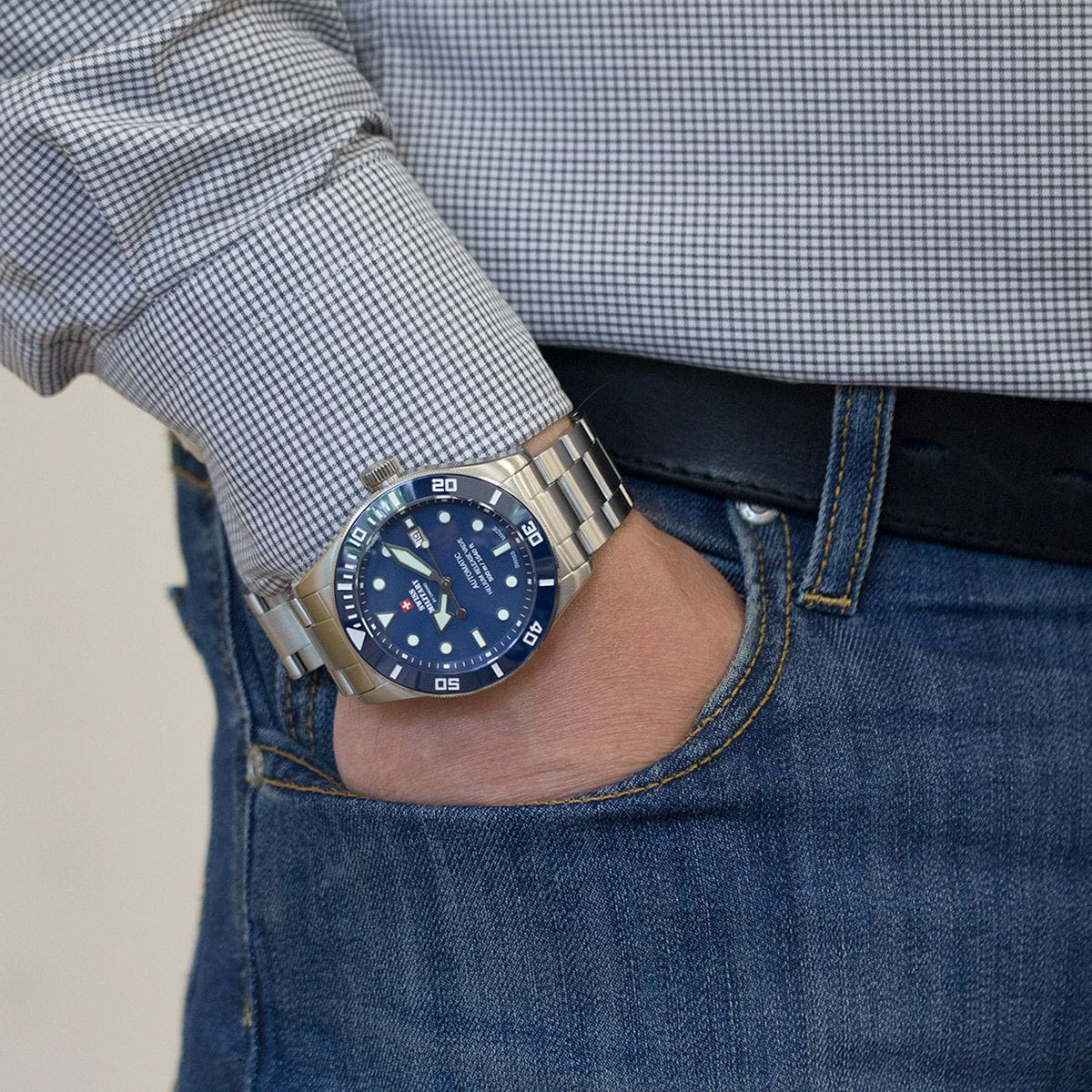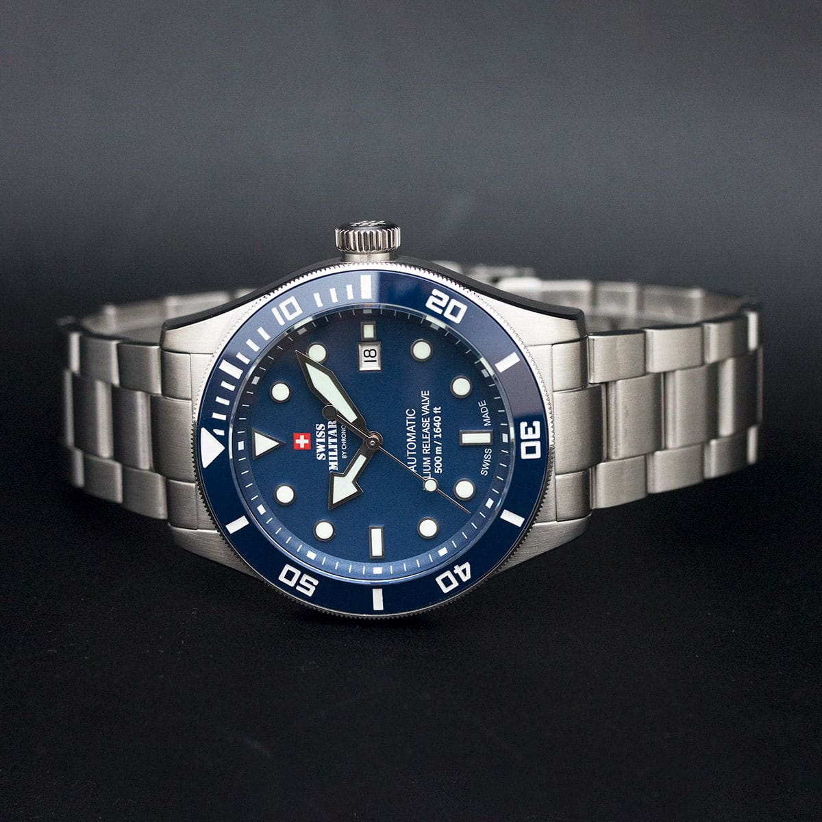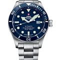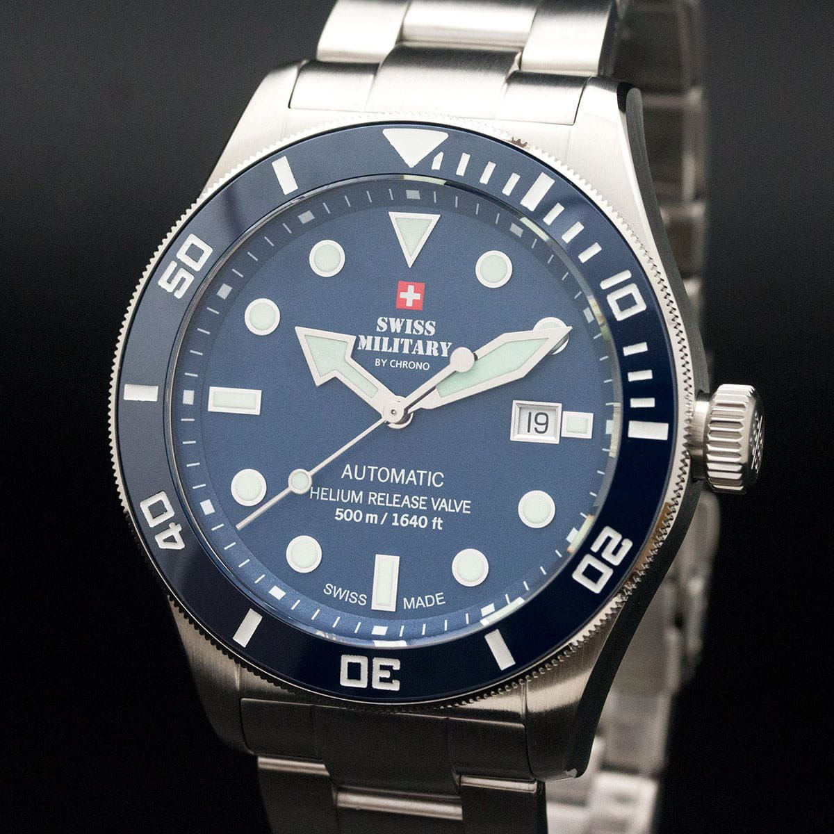 Мужские швейцарские механические часы с автоподзаводом Swiss Military by Chrono Diver SMA34075.02. Лимитированная серия из 50 экземпляров эксклюзивно для России. Механический механизм (автоматический калибр) с высокой точностью. Сапфировое стеклоСапфировое стеклоПрочный и надёжный материал из кристалла сапфира синтетического происхождения, характеризующийся особой твёрдостью и устойчивостью к царапинам и повреждениям. устойчивое к появлению царапин, обладающее высокой прозрачностью. Корпус часов изготовлен из стали, который обрамляет керамический безельБезельВнешний ободок, закрепляющий стекло. В спортивных часах так называется поворотное кольцо с делениями на циферблате, выполняет роль таймера – замеряет отрезки времени на шкале. Неподвижный безель – элемент декора. Однонаправленно вращающийся безель на дайверских часах позволяет фиксировать моменты погружения и выныривания на поверхность.. На синем циферблате центральные часовая, минутная и секундная стрелки и апертура даты в позиции 3 часов. На стрелки и метки циферблата нанесено люминесцентное покрытиеЛюминесцентное покрытиеПозволяет считывать показания времени в темноте. Производители наносят на стрелки, часовые индексы, безель или поверхность циферблата светонакопительный состав, дающий холодное свечение.. Стальной браслет матового серебристого цвета, раскладывающаяся застёжкаРаскладная застёжкаТакой тип застёжки используется только на браслетах из металла. Она никогда не раскрывается полностью, происходит разделение на 2 и более частей. Раскладывающая застёжка снизит вероятность потери часов к минимуму..