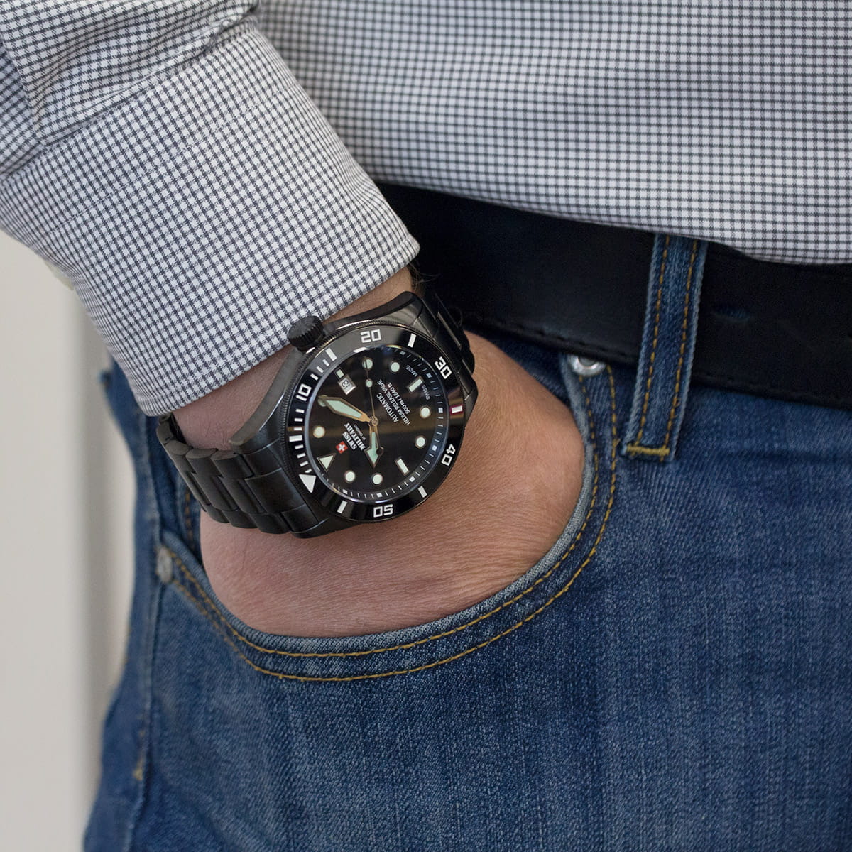 Мужские швейцарские наручные часы Swiss Military by Chrono Diver SMA34075.04, механический механизм (автоматический калибр) с высокой точностью. Сапфировое стекло устойчивое к появлению царапин, обладающее высокой прозрачностью.Корпус часов изготовлен из стали, черного цвета.