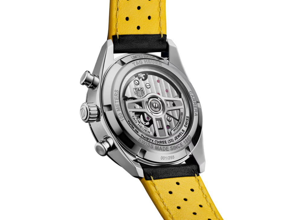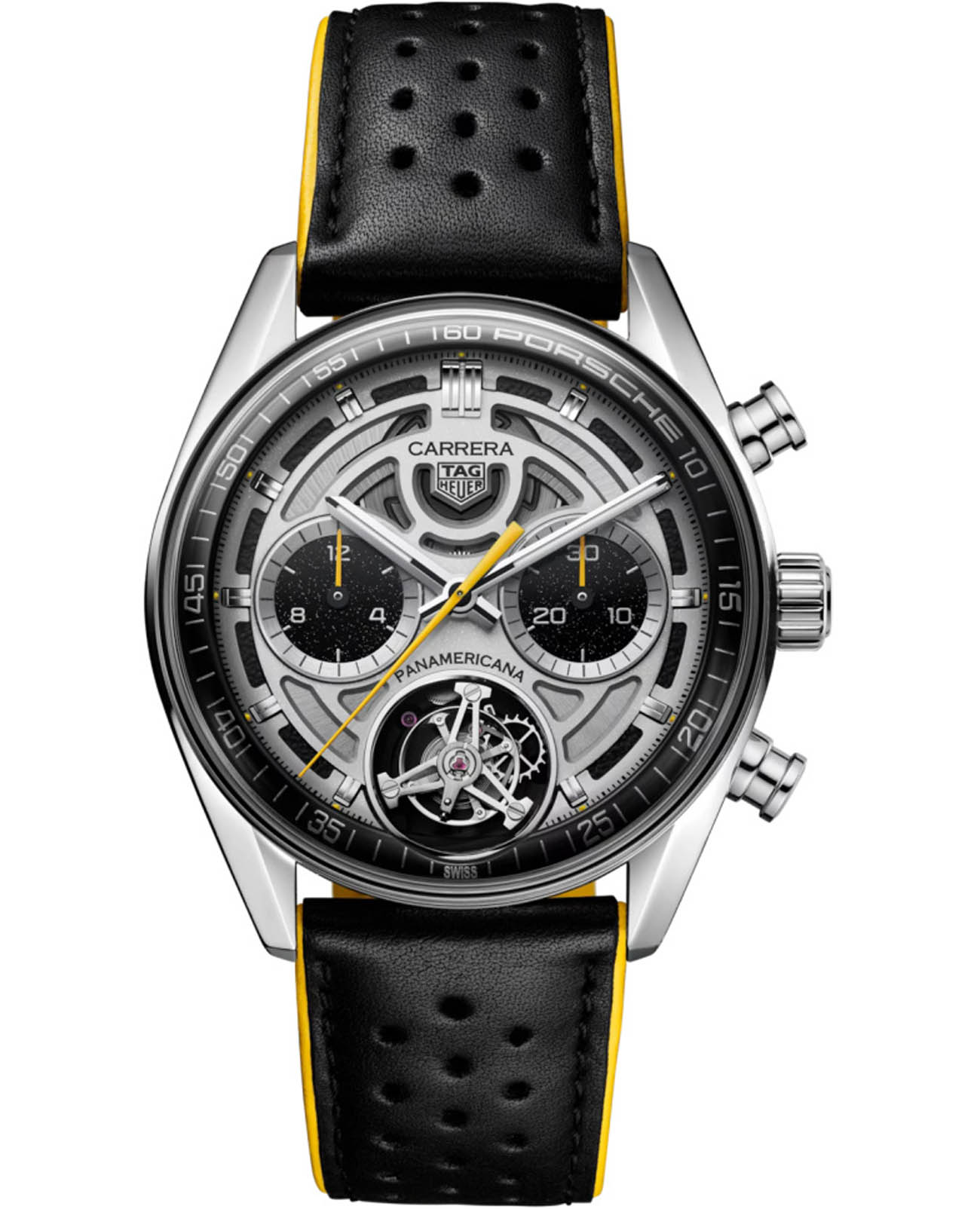 Часы TAG Heuer Carrera Chronograph Tourbillon x Porsche Panamericana CBS5012.FC6571, посвящённые легендарной гонке Carrera Panamericana и триумфальному Porsche 550 Spyder. Эта потрясающая версия поднимает классическую модель Carrera на новые высоты. Серебристый скелетонированный циферблат, вдохновленный дисками Porsche 550 Spyder, имеет тонкие желтые акценты. Часы оснащены мануфактурным механизмом TAG Heuer TH20-09. Эти часы современный шедевр, выпущенные ограниченной серией из 255 экземпляров. Фирменный дизайн циферблата придает часам эффектность, в то время как сапфировое стеклоСапфировое стеклоПрочный и надёжный материал из кристалла сапфира синтетического происхождения, характеризующийся особой твёрдостью и устойчивостью к царапинам и повреждениям. с выпуклой поверхностью обеспечивает сверхточную разборчивость.Часы-хронографХронографФункция позволяет измерять отрезки времени с особой точностью: часы, минуты, секунды. Верным признаком хронографа является наличие на циферблате 3 дополнительных окошек-счётчиков.. Механический механизм (автоматический калибр) с высокой точностью. Класс водозащиты: 100 метров, позволит плавать, нырять и заниматься другими водными видами спорта. Стрелки с люминесцентным покрытиемЛюминесцентное покрытиеПозволяет считывать показания времени в темноте. Производители наносят на стрелки, часовые индексы, безель или поверхность циферблата светонакопительный состав, дающий холодное свечение.. Корпус часов изготовлен из нержавеющей стали. Кожаный ремешок с раскладной застёжкойРаскладная застёжкаТакой тип застёжки используется только на браслетах из металла. Она никогда не раскрывается полностью, происходит разделение на 2 и более частей. Раскладывающая застёжка снизит вероятность потери часов к минимуму..