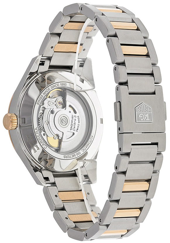 Часы с элементами из розового золота, в числе которых окошко даты и дня недели, на черном циферблате и подобранным в тон ремешком из черной кожи аллигатора. Предназначены для мужчин, живущих в ритме динамичной городской жизни. TAG Heuer Carrera WAR215E.BD0784, механический механизм (автоматический калибр) с высокой точностью. Сапфировое стекло устойчивое к появлению царапин, обладающее высокой прозрачностью. Класс водозащиты: 100 метров, позволит плавать, нырять и заниматься другими водными видами спорта. Корпус часов изготовлен из стали, разноцветного цвета.
