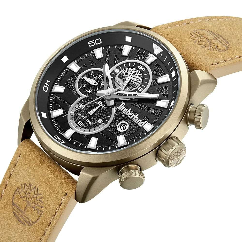 Мужские кварцевые часы Timberland — это стильный и технологичный аксессуар. Корпус диаметром 46 мм выполнен из нержавеющей стали с PVD-покрытиемPVDУльтратонкое покрытие наносится в технике вакуумного напыления, сочетает в себе нитрид титана особой прочности со слоем золота или оксида хрома. Несёт в себе декоративную или защитную функцию.. Циферблат чёрного цвета оформлен металлическими индексами и стрелками. Присутствует указатель дня недели и даты, а также 24-часовой индикатор. Часы с люминесцентным покрытиемЛюминесцентное покрытиеПозволяет считывать показания времени в темноте. Производители наносят на стрелки, часовые индексы, безель или поверхность циферблата светонакопительный состав, дающий холодное свечение., обеспечивающим длительное свечение в темноте после кратковременного нахождения на свету. Циферблат защищён минеральным стекломМинеральное стеклоМинеральное стекло представляет собой искусственно выращенный минерал кварца. Такое стекло отличается особой устойчивостью к повреждениям и царапинам. Уступает по некоторым качествам сапфировому стеклу.. Заводная головка украшена логотипом бренда. Задняя крышка выполнена из нержавеющей стали с резьбой для надёжной фиксации. Часы оснащены светло-коричневым кожаным ремешком на классической пряжке с системой быстрой замены. Водонепроницаемость 50 м позволяет использовать часы в повседневных условиях. Идеальный выбор для тех, кто ценит качество и современный дизайн.