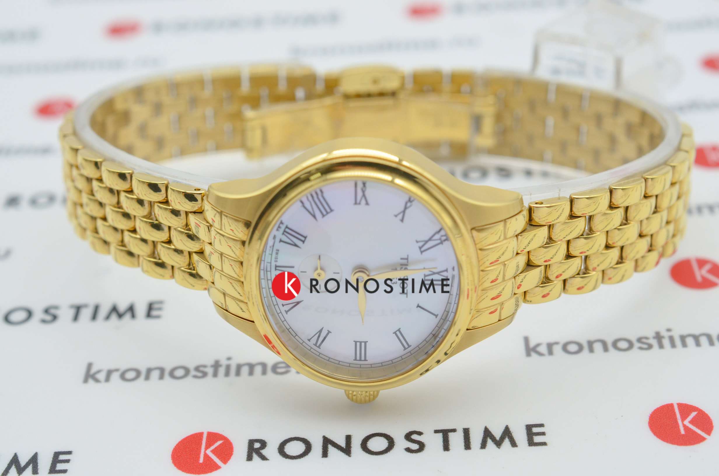 На заводной головке расположился утончённый кабашон, придающий модели женственный облик. Дополнительное очарование достигается благодаря перламутровому циферблату, плавным контурам, вогнутому безелюБезельВнешний ободок, закрепляющий стекло. В спортивных часах так называется поворотное кольцо с делениями на циферблате, выполняет роль таймера – замеряет отрезки времени на шкале. Неподвижный безель – элемент декора. Однонаправленно вращающийся безель на дайверских часах позволяет фиксировать моменты погружения и выныривания на поверхность.. Высокоточный кварцевый механизм ETA 980.153. Золотистое PVD-покрытиеPVDУльтратонкое покрытие наносится в технике вакуумного напыления, сочетает в себе нитрид титана особой прочности со слоем золота или оксида хрома. Несёт в себе декоративную или защитную функцию.. Стальной браслет с ювелирной отделкой. Отдельный мини-счётчик секунд. Сапфировое стекло отличается устойчивостью к царапинам.. Функция EOLEOLПредставляет собой систему, уведомляющую владельца часов о необходимости замены элемента питания. За 2 недели до полного разряда батарейки секундная стрелка перестаёт ходить чётко и начинает перепрыгивать на 3-4 деления.. Габариты: 24,4 x 27,2 x 7,7 мм.