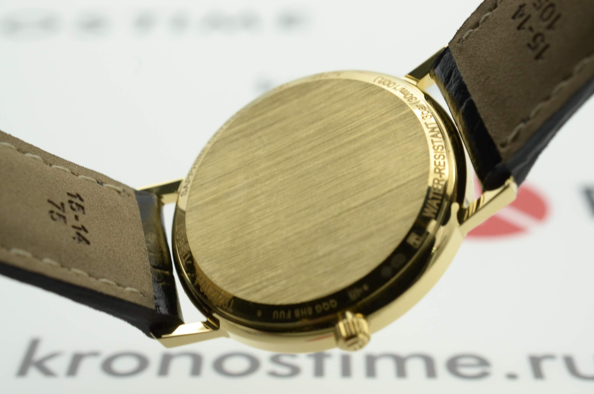 , атрибут богатства и роскоши. Высокая точность хода обеспечивается благодаря работе кварцевого механизма ETA E61.111. Сапфировое стекло устойчиво к царапинам. Чёрный ремешок из натуральной кожи. Индикатор EOLEOLПредставляет собой систему, уведомляющую владельца часов о необходимости замены элемента питания. За 2 недели до полного разряда батарейки секундная стрелка перестаёт ходить чётко и начинает перепрыгивать на 3-4 деления.. Отображение числа. Габариты: 29 x 29 x 4,9 мм.