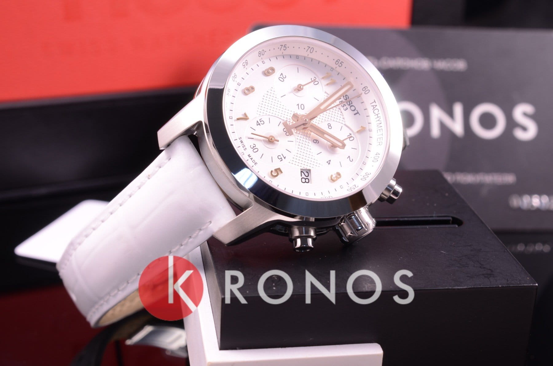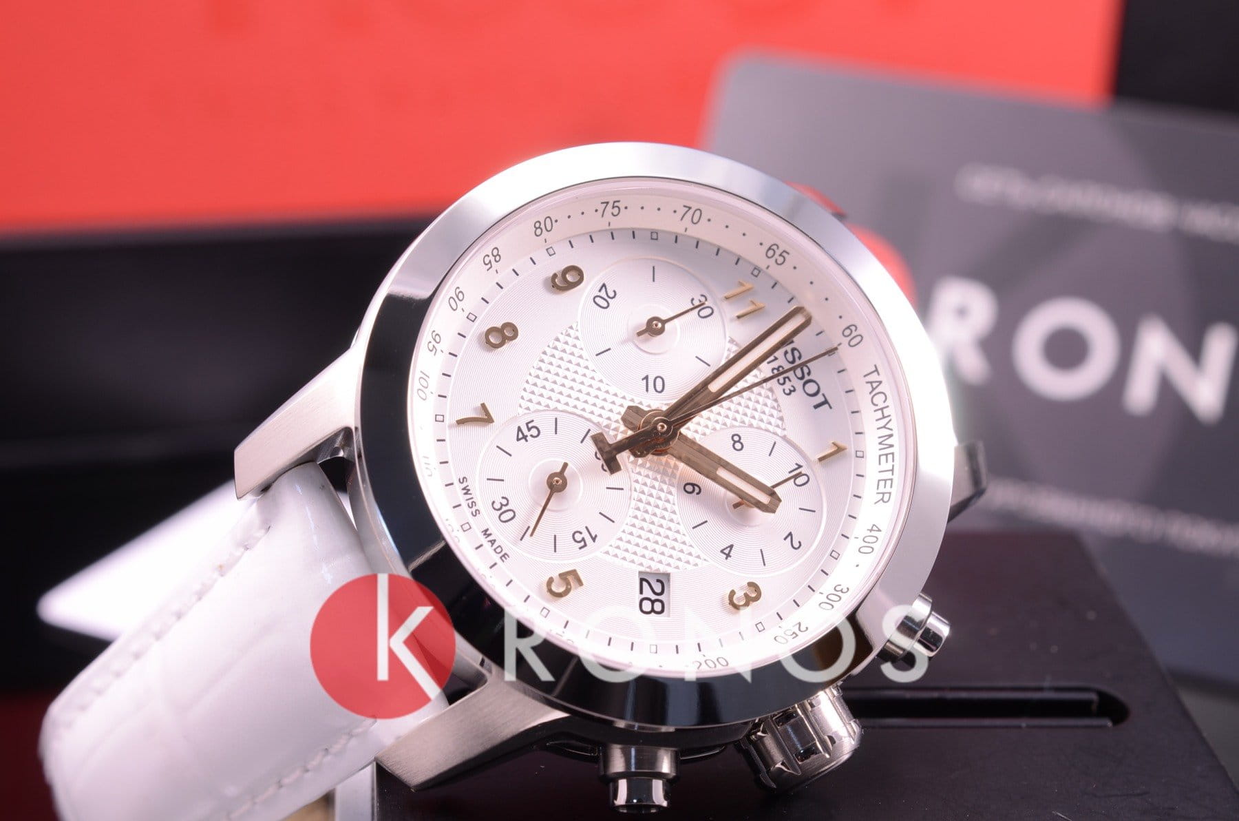 TISSOT T-Sport PRC 200 Quartz Chronograph - женские кварцевые наручные часы. Корпус этих часов среднего размера (35 мм) и выполнен из нержавеющей стали L316 металлического цвета. Модель имеет устойчивое к царапинам сапфировое стекло, ремешок из натуральной кожи белого цвета, белый циферблат. Калибр механизма: ETA G15.211. Класс водозащиты: 200 м / 20 АТМ (разрешается нырять с аквалангом на глубину). Дополнительные функции и особенности: отображение числа, хронограф (секундомер), тахиметр