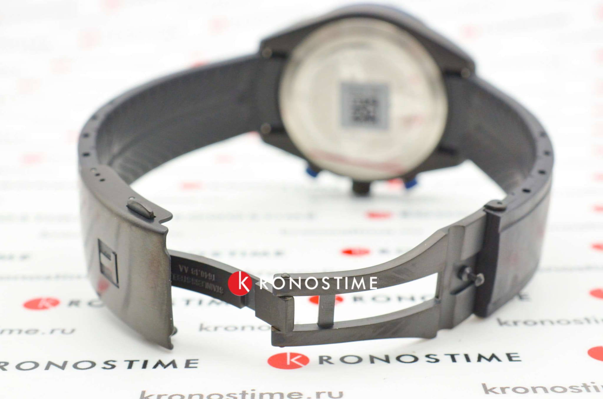 Тёмный циферблат с оригинальным узором отличается спортивным дизайном, такое исполнение актуально при любых обстоятельствах. Часы имеют голубые цветовые акценты, добавляющие динамичности. Кварцевый хронографХронографФункция позволяет измерять отрезки времени с особой точностью: часы, минуты, секунды. Верным признаком хронографа является наличие на циферблате 3 дополнительных окошек-счётчиков. с механизмом ETA G10.212 работает от батарейки, отпадает необходимость постоянного завода. Водостойкость до 10 бар. Керамический узорчатый безельБезельВнешний ободок, закрепляющий стекло. В спортивных часах так называется поворотное кольцо с делениями на циферблате, выполняет роль таймера – замеряет отрезки времени на шкале. Неподвижный безель – элемент декора. Однонаправленно вращающийся безель на дайверских часах позволяет фиксировать моменты погружения и выныривания на поверхность.. Сапфировое стекло с антибликовым покрытием. Шкала тахиметраТахиметрРазмеченная шкала, располагается на ободке или безеле часов. Тахиметр позволяет рассчитать скорость на определённом участке пути, расстояние измеряется в километрах или милях.. Корпус из нержавеющей стали 316L. Люминесцентная подсветкаЛюминесцентное покрытиеПозволяет считывать показания времени в темноте. Производители наносят на стрелки, часовые индексы, безель или поверхность циферблата светонакопительный состав, дающий холодное свечение.. Каучуковый ремешок. . Секундомер, индикация даты. Габариты: 42 x 42 x 12,1 мм.