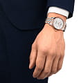 Аксессуар обладает индивидуальными деталями, присущими данной коллекции. Узорчатый циферблат, задняя крышка с причудливым орнаментом, тонкие стрелки и римские цифры. На корпус и продольные звенья браслета нанесено PVD-покрытиеPVDУльтратонкое покрытие наносится в технике вакуумного напыления, сочетает в себе нитрид титана особой прочности со слоем золота или оксида хрома. Несёт в себе декоративную или защитную функцию. цвета розового золота. Автоматический калибр Powermatic 80Powermatic 80Эксклюзивный калибр от швейцарской компании ETA с увеличенным запасом хода до 80 часов за счёт удлинённой заводной пружины. Характеризуется улучшенной системой спуска со сниженным трением. с запасом хода 80 часов. Стекло из сапфира. Инкрустация бриллиантами. . Апертура даты. Габариты: 39,3 x 39,3 x 9,75 мм.