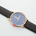 На синем циферблате расположены арабские цифры 6 и 12, остальные заменяют лаконичные часовые метки делений. Корпус имеет PVD-покрытиеPVDУльтратонкое покрытие наносится в технике вакуумного напыления, сочетает в себе нитрид титана особой прочности со слоем золота или оксида хрома. Несёт в себе декоративную или защитную функцию. в цвете "розовое золото", такое исполнение аксессуара делает его более привлекательным. Работа часов осуществляется благодаря кварцевому механизму ETA F06.111 с высокой точностью хода. Ремешок из натуральной кожи с тиснением под кожу крокодила. Сапфировое стекло. . Индикация даты. Габариты: 42 x 42 x 7,47 мм.