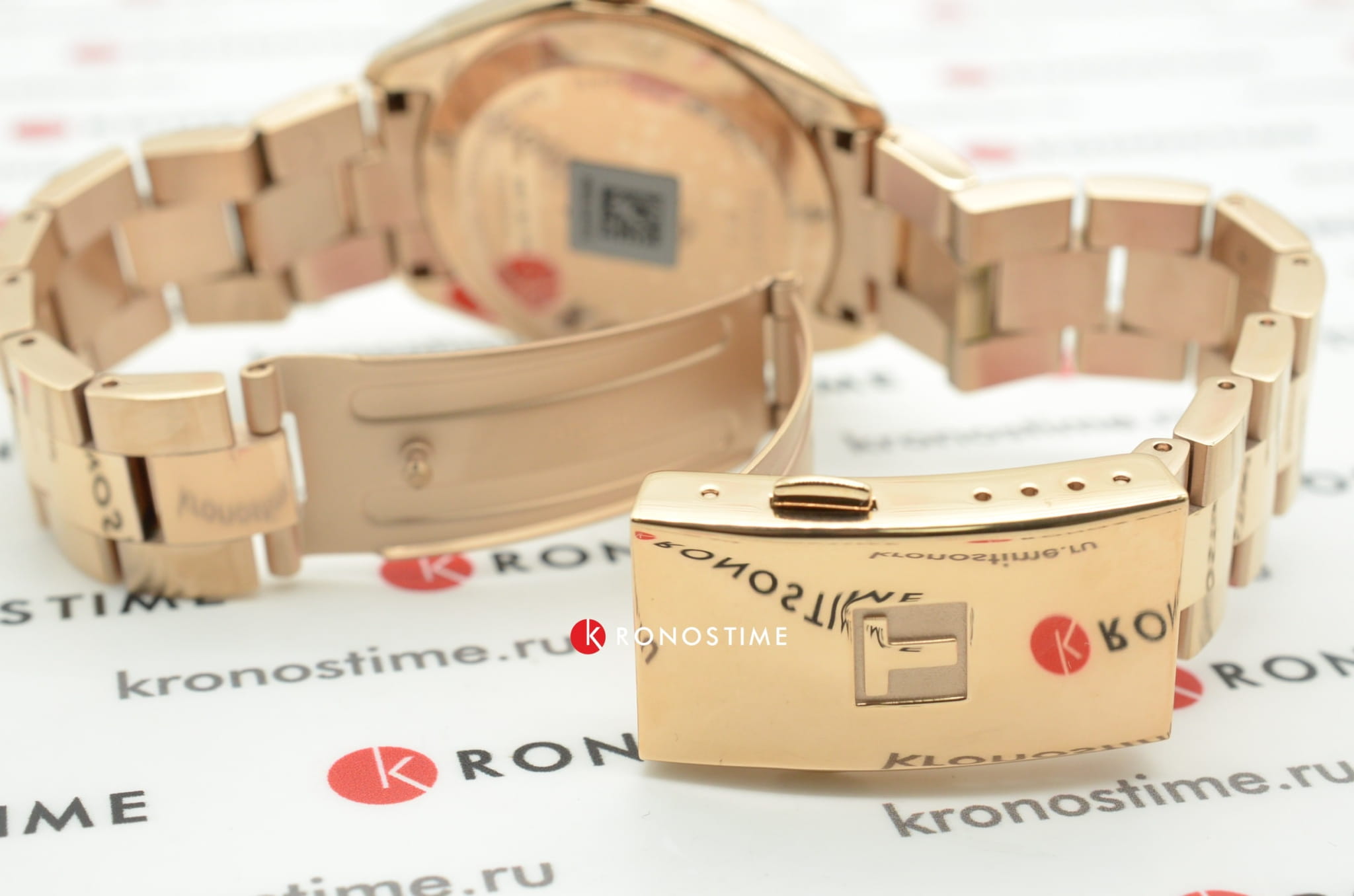 Стильный перламутровый циферблат инкрустирован 12 бриллиантами цвета Top Wesselton, роскошные переливы завораживают и приманивают взгляды окружающих. Драгоценные камни гарантировано имеют законное происхождение и никогда не были замешаны в финансовых конфликтах. Модель имеет привлекательное PVD-покрытиеPVDУльтратонкое покрытие наносится в технике вакуумного напыления, сочетает в себе нитрид титана особой прочности со слоем золота или оксида хрома. Несёт в себе декоративную или защитную функцию. в цвете розового золота. Часы оснащены высокоточным кварцевым калибром ETA 955.412 с 7 камнями. Люминесцентная подсветкаЛюминесцентное покрытиеПозволяет считывать показания времени в темноте. Производители наносят на стрелки, часовые индексы, безель или поверхность циферблата светонакопительный состав, дающий холодное свечение. стрелок. Надёжное сапфировое стекло. Индикация текущего числа, функция EOLEOLПредставляет собой систему, уведомляющую владельца часов о необходимости замены элемента питания. За 2 недели до полного разряда батарейки секундная стрелка перестаёт ходить чётко и начинает перепрыгивать на 3-4 деления.. Габариты: 36 x 36 x 9 мм.