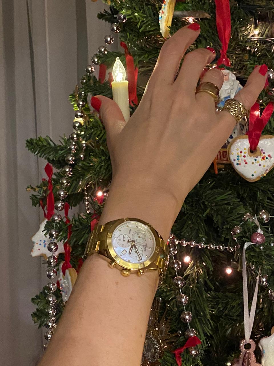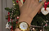 Стильный хронографХронографФункция позволяет измерять отрезки времени с особой точностью: часы, минуты, секунды. Верным признаком хронографа является наличие на циферблате 3 дополнительных окошек-счётчиков. наделён женственным внешним обликом. Перламутровый циферблат дополнен драгоценными камнями, вместо часовых индексов используются 12 бриллиантов в 0,0456 карат. Швейцарский кварцевый механизм ETA G15.212. Сапфировое стекло не допускает возникновения царапин. Водонепроницаемость до 10 бар. PVD-покрытиеPVDУльтратонкое покрытие наносится в технике вакуумного напыления, сочетает в себе нитрид титана особой прочности со слоем золота или оксида хрома. Несёт в себе декоративную или защитную функцию. золотистого цвета. Стрелки с люминесцентной подсветкойЛюминесцентное покрытиеПозволяет считывать показания времени в темноте. Производители наносят на стрелки, часовые индексы, безель или поверхность циферблата светонакопительный состав, дающий холодное свечение.. Браслет с . Отображение даты, секундомер. Габариты: 38 x 38 x 10,5 мм.