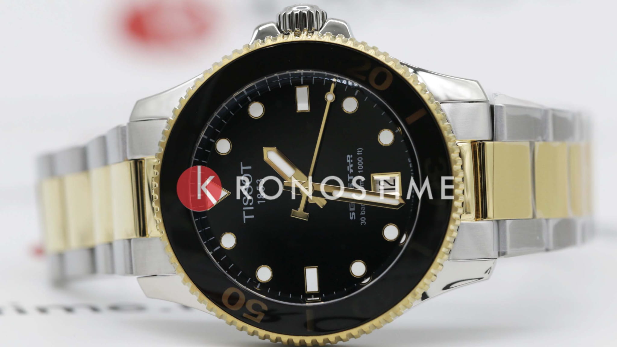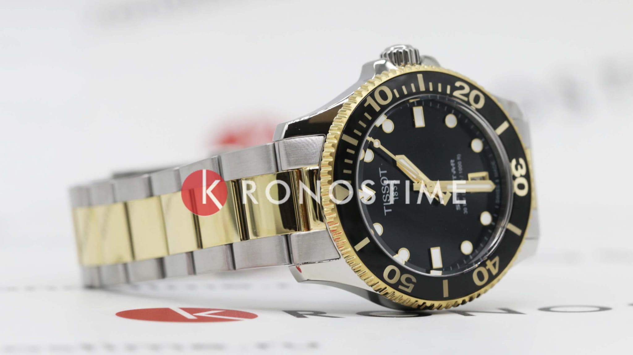 Мужские швейцарские часы Tissot Seastar 1000 36mm T120.210.22.051.00, кварцевый механизм с высокой точностью. Сапфировое стеклоСапфировое стеклоПрочный и надёжный материал из кристалла сапфира синтетического происхождения, характеризующийся особой твёрдостью и устойчивостью к царапинам и повреждениям. устойчивое к появлению царапин, обладающее высокой прозрачностью. Корпус часов изготовлен из нержавеющей стали. Вращающийся безельБезельВнешний ободок, закрепляющий стекло. В спортивных часах так называется поворотное кольцо с делениями на циферблате, выполняет роль таймера – замеряет отрезки времени на шкале. Неподвижный безель – элемент декора. Однонаправленно вращающийся безель на дайверских часах позволяет фиксировать моменты погружения и выныривания на поверхность. из нержавеющей стали с PVD-покрытиемPVDУльтратонкое покрытие наносится в технике вакуумного напыления, сочетает в себе нитрид титана особой прочности со слоем золота или оксида хрома. Несёт в себе декоративную или защитную функцию.. Стрелки с люминесцентным покрытиемЛюминесцентное покрытиеПозволяет считывать показания времени в темноте. Производители наносят на стрелки, часовые индексы, безель или поверхность циферблата светонакопительный состав, дающий холодное свечение.. Окошко даты в положении 6 часов. Класс водозащиты: 200 метров, позволит плавать, нырять и заниматься другими водными видами спорта. Стальной браслет с частичным с PVD-покрытиемPVDУльтратонкое покрытие наносится в технике вакуумного напыления, сочетает в себе нитрид титана особой прочности со слоем золота или оксида хрома. Несёт в себе декоративную или защитную функцию. на раскладной застёжкеРаскладная застёжкаТакой тип застёжки используется только на браслетах из металла. Она никогда не раскрывается полностью, происходит разделение на 2 и более частей. Раскладывающая застёжка снизит вероятность потери часов к минимуму..