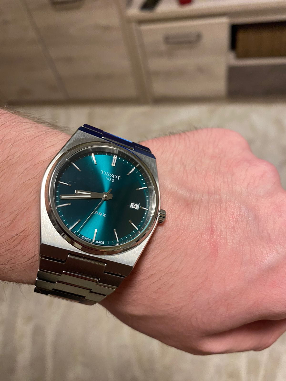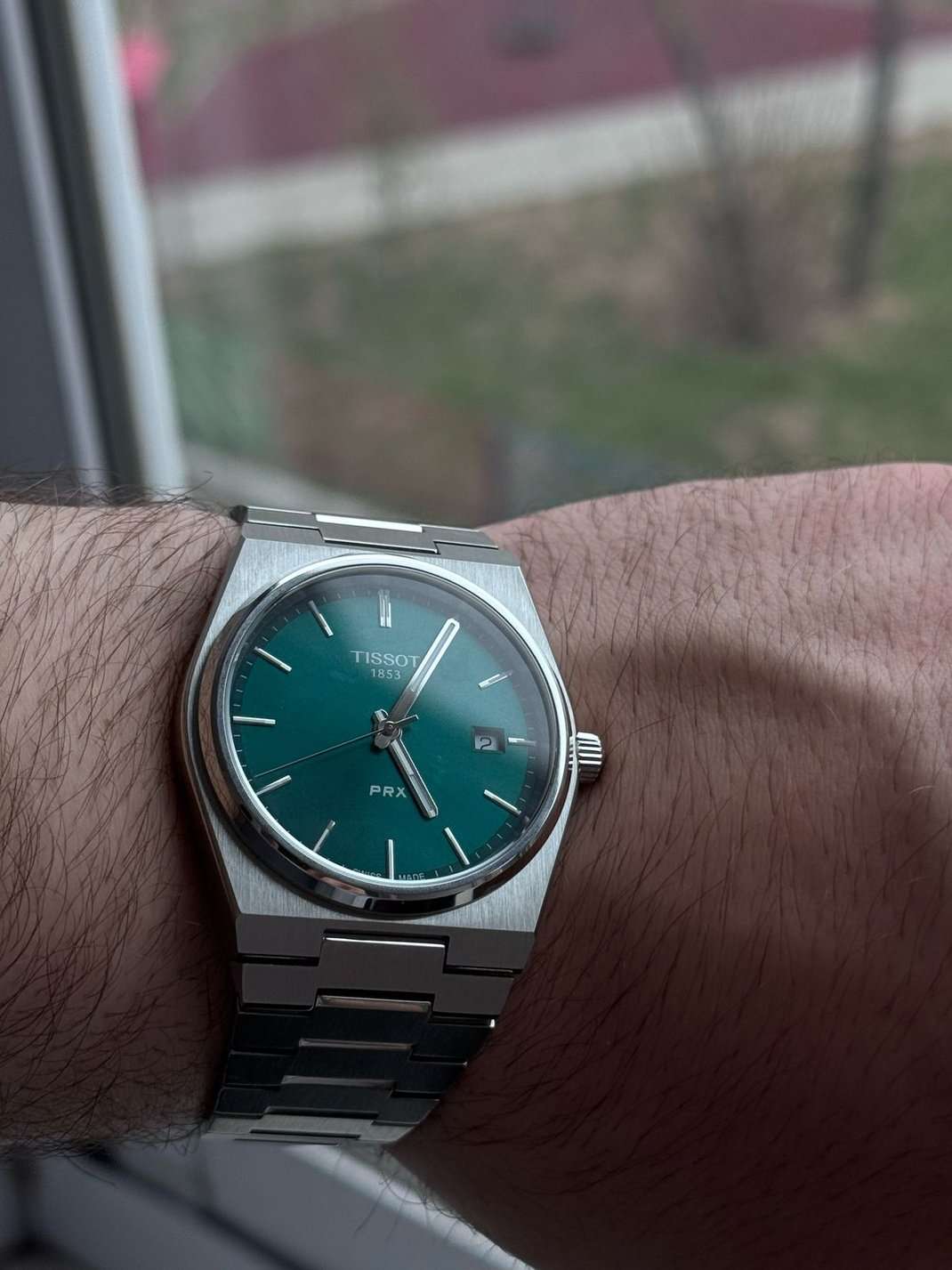 Tissot PRX 40mm (модель T137.410.11.091.00) – элегантные мужские часы, сочетающие современный стиль с передовыми технологиями. Корпус диаметром 40 мм выполнен из нержавеющей стали 316L, что обеспечивает надёжность и долговечность. Зелёный циферблат с эффектом солнечных лучей защищён сапфировым стекломСапфировое стеклоПрочный и надёжный материал из кристалла сапфира синтетического происхождения, характеризующийся особой твёрдостью и устойчивостью к царапинам и повреждениям., устойчивым к царапинам.