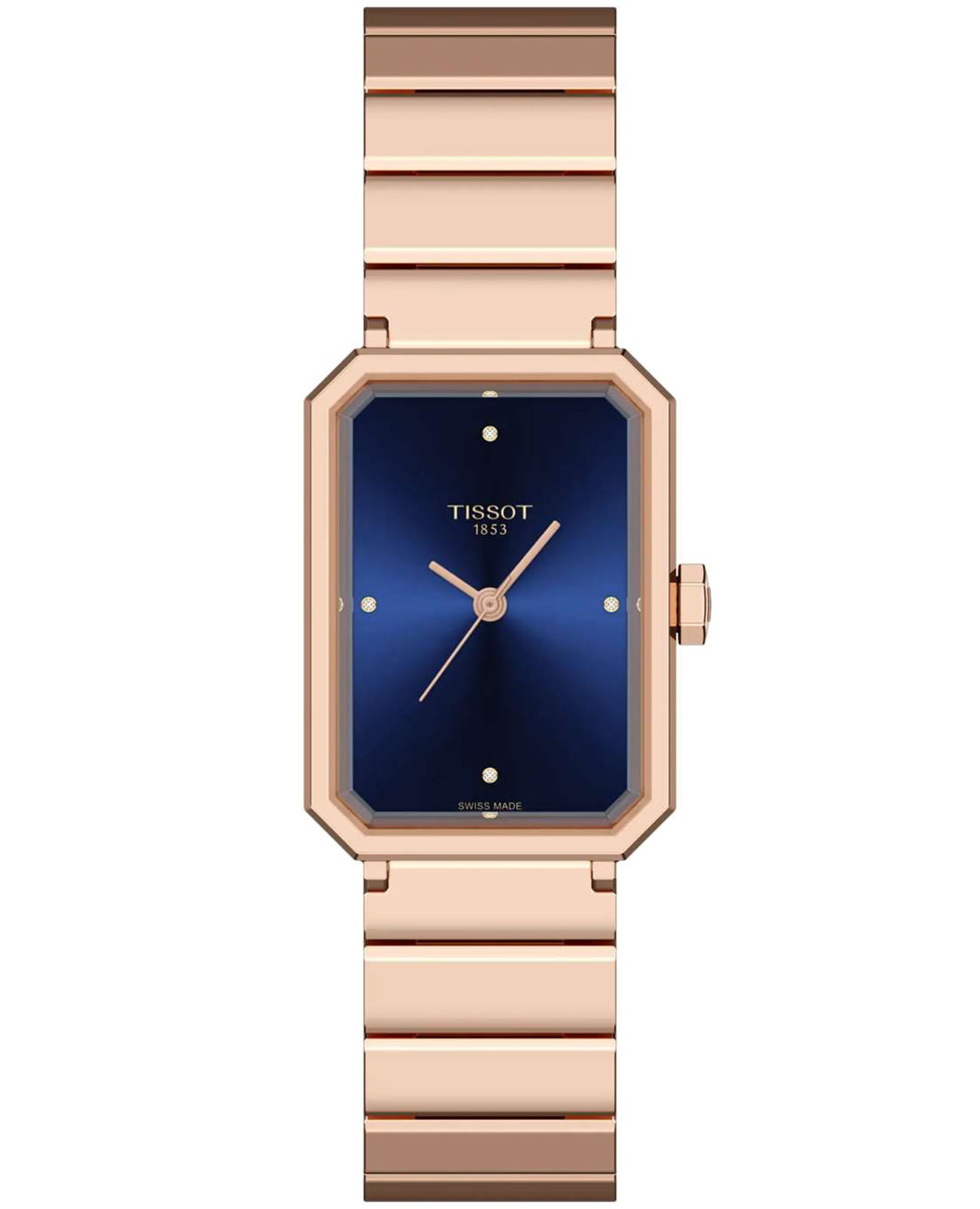 Женские кварцевые часы Tissot из коллекции Classic Contemporary — это элегантный аксессуар, вдохновлённый стилем ар-деко 1920-х годов. Модель SRV сочетает геометрические формы и ретро-эстетику с современной технологией. Корпус прямоугольной формы размером 30×21,8 мм выполнен из нержавеющей стали 316L с PVD-покрытиемPVDУльтратонкое покрытие наносится в технике вакуумного напыления, сочетает в себе нитрид титана особой прочности со слоем золота или оксида хрома. Несёт в себе декоративную или защитную функцию. цвета розового золота. Циферблат тёмно-синего цвета оформлен четырьмя настоящими бриллиантами на позициях 12, 3, 6 и 9 часов. Циферблат защищён сапфировым стекломСапфировое стеклоПрочный и надёжный материал из кристалла сапфира синтетического происхождения, характеризующийся особой твёрдостью и устойчивостью к царапинам и повреждениям. с фасетированной огранкой, повторяющей форму корпуса. Часы оснащены стальным браслетом с PVD-покрытиемPVDУльтратонкое покрытие наносится в технике вакуумного напыления, сочетает в себе нитрид титана особой прочности со слоем золота или оксида хрома. Несёт в себе декоративную или защитную функцию. цвета розового золота на застёжке «бабочка» с кнопкамиЗастёжка "бабочка"Такой вид застёжки дополняется предохранителями, помогающими избежать случайного раскрытия браслета. Обладают изящным исполнением. со системой быстрой замены ремешка. Водонепроницаемость 50 м позволяет использовать часы в повседневных условиях. Идеальный выбор для тех, кто ценит стиль, наследие и швейцарское качество.