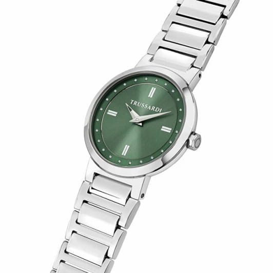 Итальянские женские часы Trussardi T-Bridge R2453171509 - это стильный женский аксессуар, который сочетает элегантный дизайн и практичность. Корпус выполнен из нержавеющей стали, что обеспечивает долговечность и утончённый внешний вид. Надежное минеральное стеклоМинеральное стеклоМинеральное стекло представляет собой искусственно выращенный минерал кварца. Такое стекло отличается особой устойчивостью к повреждениям и царапинам. Уступает по некоторым качествам сапфировому стеклу. защищает циферблат с кристаллами от царапин и обеспечивает долговечность. Модель оснащена кварцевым механизмом, обеспечивающим высокую точность хода. Браслет из нержавеющей стали на раскладной застёжкеРаскладная застёжкаТакой тип застёжки используется только на браслетах из металла. Она никогда не раскрывается полностью, происходит разделение на 2 и более частей. Раскладывающая застёжка снизит вероятность потери часов к минимуму. обеспечивает комфортное ношение. Водозащита 50 метров позволит защитить корпус от случайных брызг или капель дождя. Эта модель – отличный выбор для тех, кто ищет сочетание стиля, качества и функциональности. Часы станут не только полезным аксессуаром, но и выразительным элементом вашего имиджа.