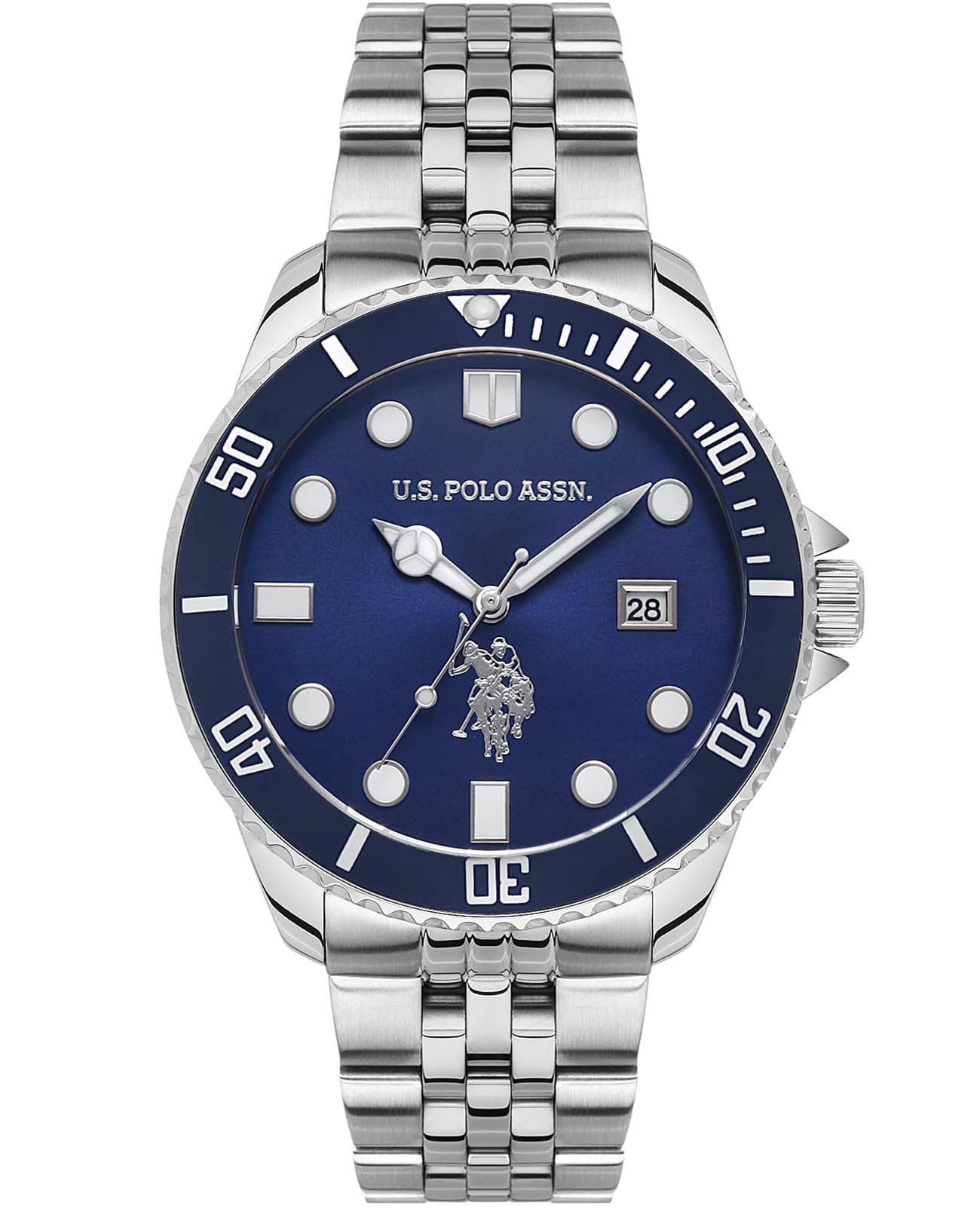Мужские часы U.S. Polo Assn. Fundamental USPA1048-05, кварцевый механизм с высокой точностью. Минеральное стеклоМинеральное стеклоМинеральное стекло представляет собой искусственно выращенный минерал кварца. Такое стекло отличается особой устойчивостью к повреждениям и царапинам. Уступает по некоторым качествам сапфировому стеклу. устойчивое к появлению царапин, обладающее высокой прозрачностью. Центральные часовая, минутная и секундная стрелки. Корпус изготовлен из нержавеющей стали. Класс водозащиты: 50 метров, позволит защитить корпус от случайных брызг или капель дождя. Стальной браслет на раскладной застёжкеРаскладная застёжкаТакой тип застёжки используется только на браслетах из металла. Она никогда не раскрывается полностью, происходит разделение на 2 и более частей. Раскладывающая застёжка снизит вероятность потери часов к минимуму.. Стрелки и метки с люминесцентным покрытиемЛюминесцентное покрытиеПозволяет считывать показания времени в темноте. Производители наносят на стрелки, часовые индексы, безель или поверхность циферблата светонакопительный состав, дающий холодное свечение.. БезельБезельВнешний ободок, закрепляющий стекло. В спортивных часах так называется поворотное кольцо с делениями на циферблате, выполняет роль таймера – замеряет отрезки времени на шкале. Неподвижный безель – элемент декора. Однонаправленно вращающийся безель на дайверских часах позволяет фиксировать моменты погружения и выныривания на поверхность. с IP-покрытиемIP-покрытиеМетод ионного напыления. Демонстрирует повышенную устойчивость к истиранию, окислению и химическим веществам. Под воздействием высокого давления и температуры около 1500°C молекулы металла надёжно соединяются с частицами корпуса часов.. Окошко даты находится в положении 3 часа.