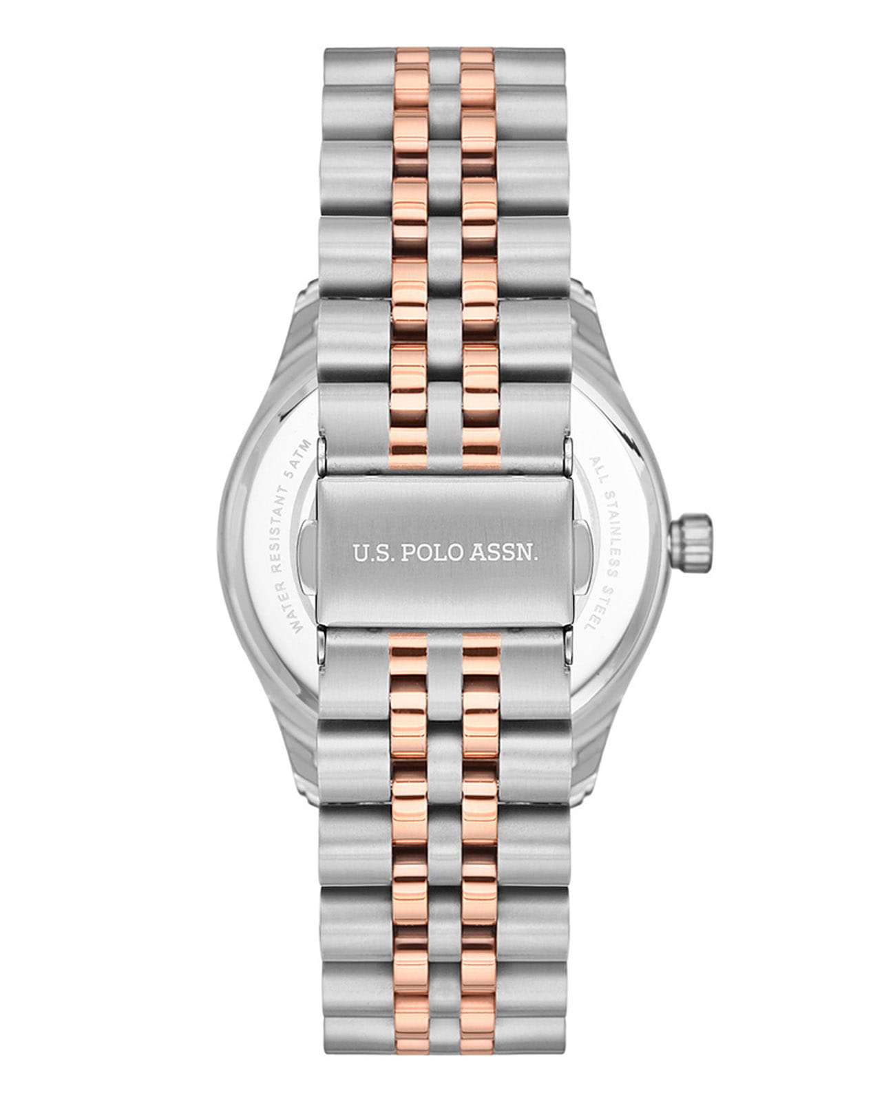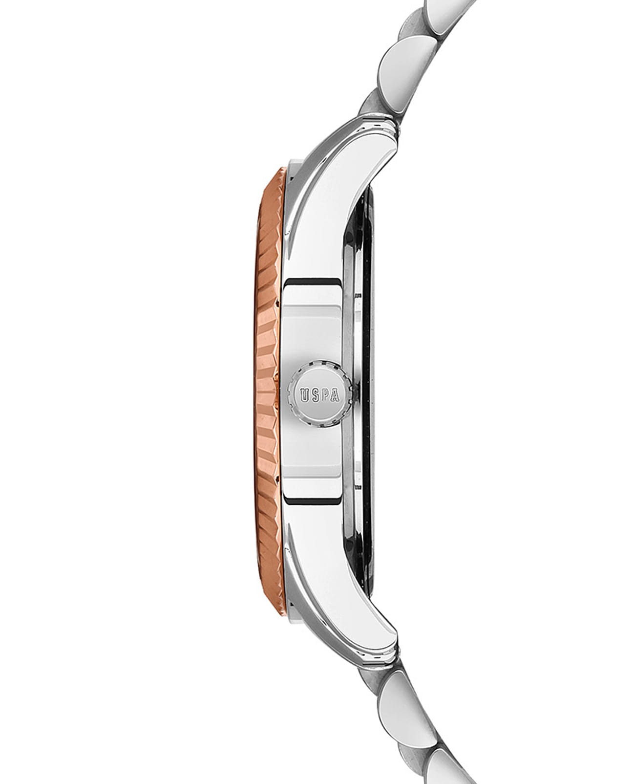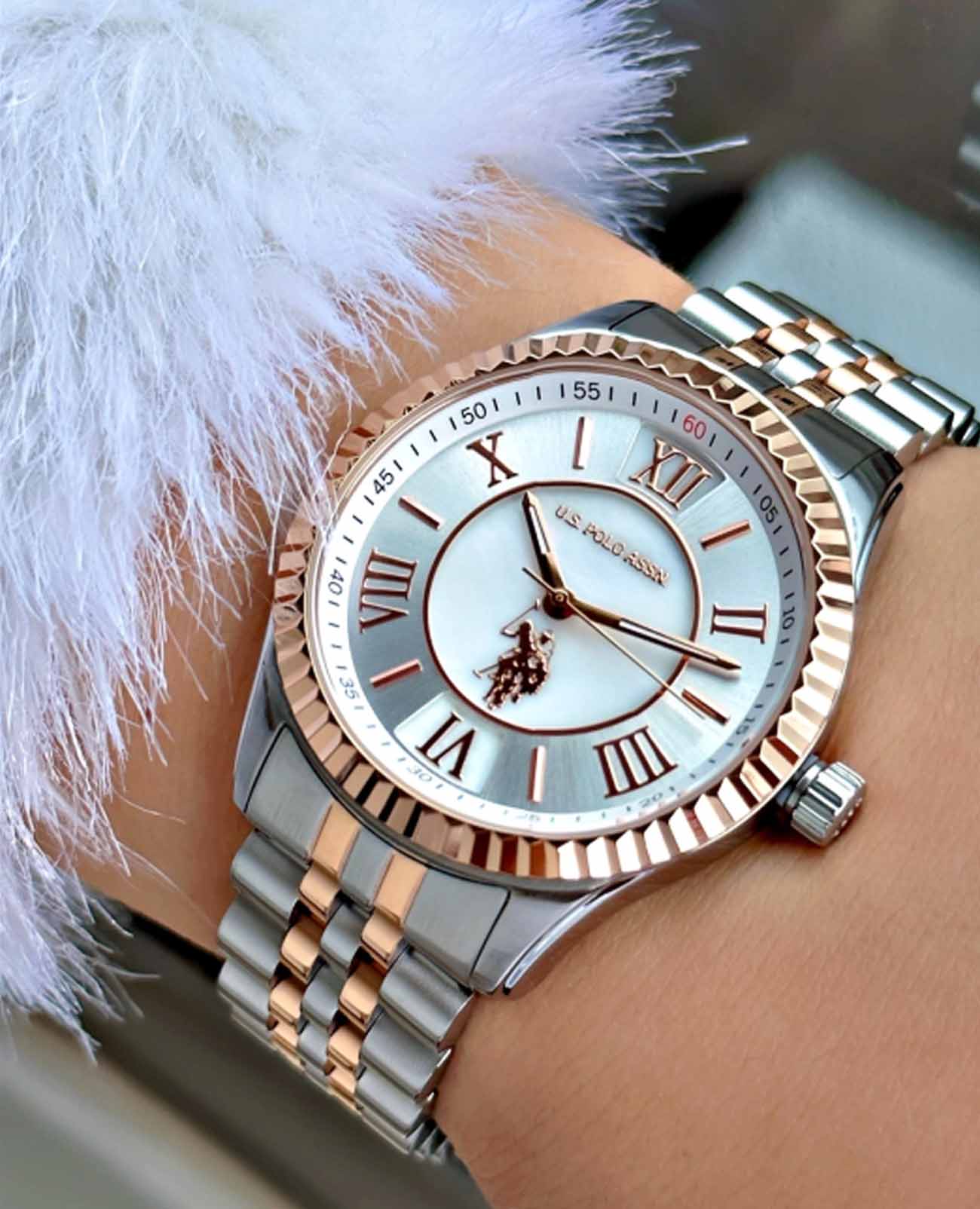 Женские часы U.S. Polo Assn Stile USPA2028-02, кварцевый механизм с высокой точностью. Минеральное стеклоМинеральное стеклоМинеральное стекло представляет собой искусственно выращенный минерал кварца. Такое стекло отличается особой устойчивостью к повреждениям и царапинам. Уступает по некоторым качествам сапфировому стеклу. устойчивое к появлению царапин, обладающее высокой прозрачностью. Корпус часов изготовлен из нержавеющей стали. БезельБезельВнешний ободок, закрепляющий стекло. В спортивных часах так называется поворотное кольцо с делениями на циферблате, выполняет роль таймера – замеряет отрезки времени на шкале. Неподвижный безель – элемент декора. Однонаправленно вращающийся безель на дайверских часах позволяет фиксировать моменты погружения и выныривания на поверхность. с IP-покрытиемIP-покрытиеМетод ионного напыления. Демонстрирует повышенную устойчивость к истиранию, окислению и химическим веществам. Под воздействием высокого давления и температуры около 1500°C молекулы металла надёжно соединяются с частицами корпуса часов.. Стрелки с люминесцентным покрытиемЛюминесцентное покрытиеПозволяет считывать показания времени в темноте. Производители наносят на стрелки, часовые индексы, безель или поверхность циферблата светонакопительный состав, дающий холодное свечение.. Класс водозащиты: 50 метров, позволит защитить корпус от случайных брызг или капель дождя. Стальной браслет с частичным IP-покрытиемIP-покрытиеМетод ионного напыления. Демонстрирует повышенную устойчивость к истиранию, окислению и химическим веществам. Под воздействием высокого давления и температуры около 1500°C молекулы металла надёжно соединяются с частицами корпуса часов. на раскладной застёжкеРаскладная застёжкаТакой тип застёжки используется только на браслетах из металла. Она никогда не раскрывается полностью, происходит разделение на 2 и более частей. Раскладывающая застёжка снизит вероятность потери часов к минимуму..