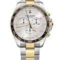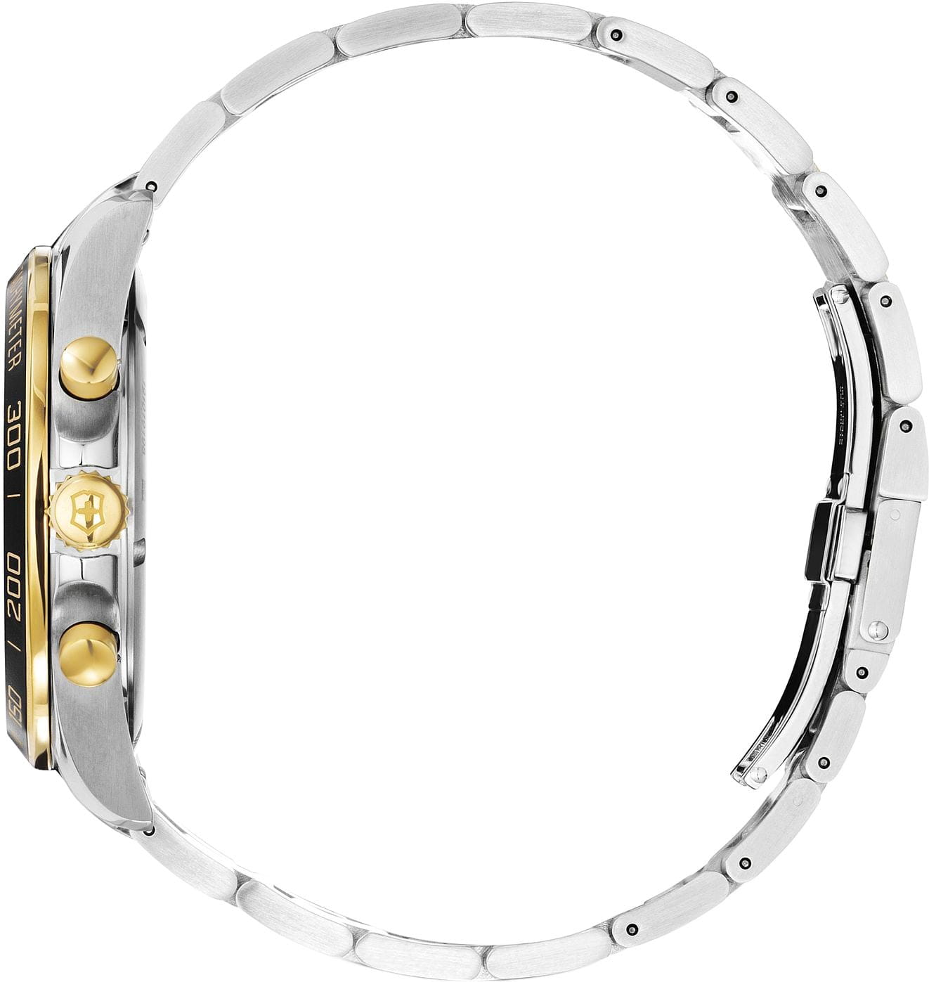 Мужские швейцарские часы-хронографХронографФункция позволяет измерять отрезки времени с особой точностью: часы, минуты, секунды. Верным признаком хронографа является наличие на циферблате 3 дополнительных окошек-счётчиков. Victorinox Fieldforce Chronograph 241903 с надёжным кварцевым механизмом. Сапфировое стеклоСапфировое стеклоПрочный и надёжный материал из кристалла сапфира синтетического происхождения, характеризующийся особой твёрдостью и устойчивостью к царапинам и повреждениям. с трёхслойным антибликовым покрытием. Корпус часов выполнен из нержавеющей стали 316L. Стальной браслет с частичным PVD-покрытиемPVDУльтратонкое покрытие наносится в технике вакуумного напыления, сочетает в себе нитрид титана особой прочности со слоем золота или оксида хрома. Несёт в себе декоративную или защитную функцию. на раскладной застёжкеРаскладная застёжкаТакой тип застёжки используется только на браслетах из металла. Она никогда не раскрывается полностью, происходит разделение на 2 и более частей. Раскладывающая застёжка снизит вероятность потери часов к минимуму.. Влагозащита: 100 метров, позволит плавать, нырять и заниматься другими водными видами спорта. Окошко даты находится в положении 6 часов, стрелки и метки с люминесцентным покрытиемЛюминесцентное покрытиеПозволяет считывать показания времени в темноте. Производители наносят на стрелки, часовые индексы, безель или поверхность циферблата светонакопительный состав, дающий холодное свечение., тахиметрТахиметрРазмеченная шкала, располагается на ободке или безеле часов. Тахиметр позволяет рассчитать скорость на определённом участке пути, расстояние измеряется в километрах или милях..