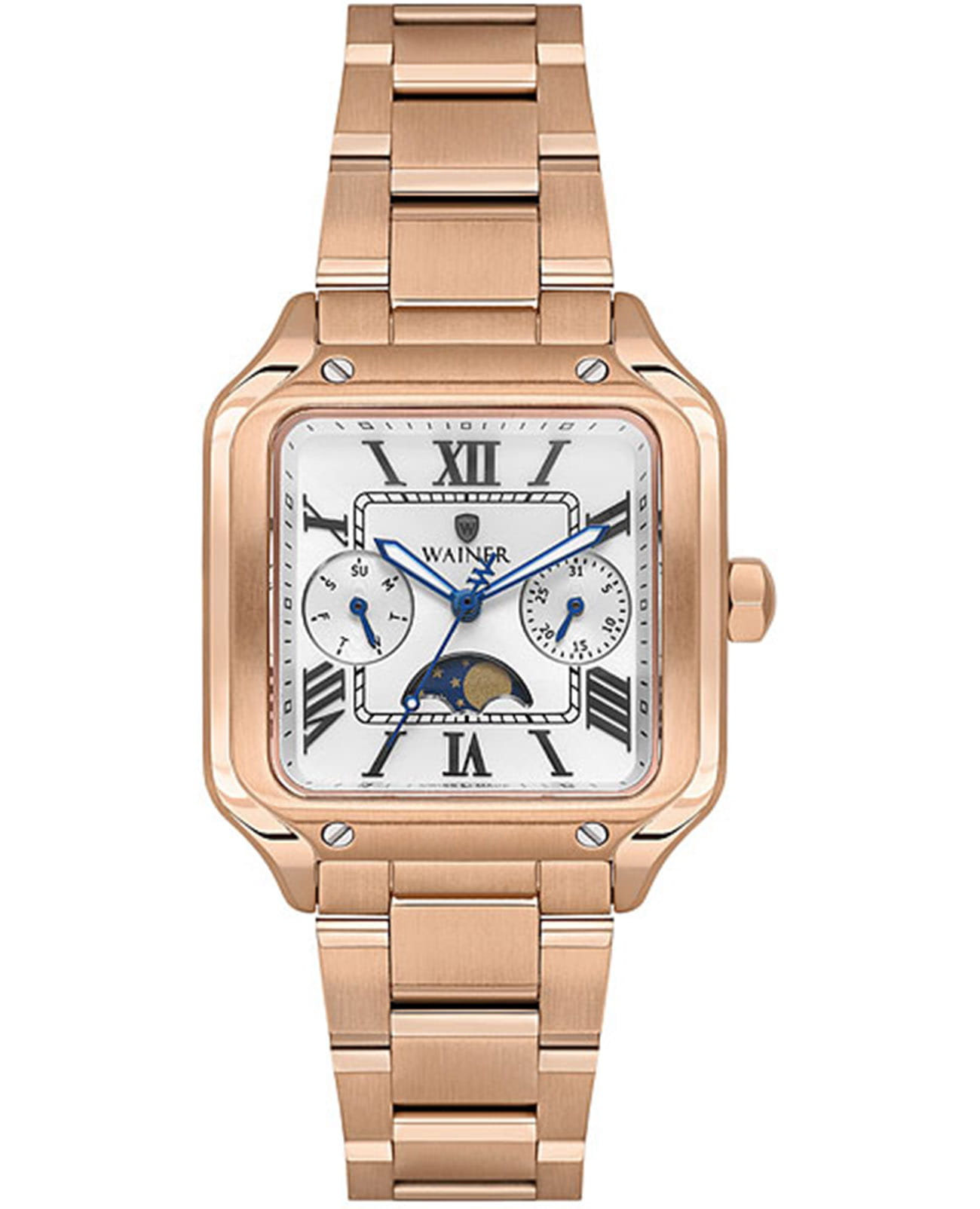 Женские кварцевые часы Wainer Vintage — это изысканный аксессуар, сочетающий в себе швейцарское качество и элегантный дизайн. Модель выполнена в квадратной форме из нержавеющей стали 316L с PVD-покрытиемPVDУльтратонкое покрытие наносится в технике вакуумного напыления, сочетает в себе нитрид титана особой прочности со слоем золота или оксида хрома. Несёт в себе декоративную или защитную функцию., что придаёт ей устойчивость к царапинам и благородный внешний вид. Циферблат белого цвета дополнен индикатором фазы Луны, датой и днём недели, а его поверхность защищена сапфировым стекломСапфировое стеклоПрочный и надёжный материал из кристалла сапфира синтетического происхождения, характеризующийся особой твёрдостью и устойчивостью к царапинам и повреждениям., устойчивым к повреждениям. Гранёная заводная головка с защитой обеспечивает надёжную фиксацию на запястье. Браслет из стали с покрытием шириной 16 мм оснащён Раскладная застёжкаРаскладная застёжкаТакой тип застёжки используется только на браслетах из металла. Она никогда не раскрывается полностью, происходит разделение на 2 и более частей. Раскладывающая застёжка снизит вероятность потери часов к минимуму., обеспечивающей комфорт и надёжную фиксацию. Часы водонепроницаемы до 50 метров (, что позволяет использовать их при мытье рук или под лёгким дождём. Стрелки и индексы имеют Люминесцентное покрытиеЛюминесцентное покрытиеПозволяет считывать показания времени в темноте. Производители наносят на стрелки, часовые индексы, безель или поверхность циферблата светонакопительный состав, дающий холодное свечение., обеспечивающее отличную читаемость даже в условиях слабого освещения. Механизм калибра Ronda 706.1 гарантирует точность хода и надёжность. Эти часы станут универсальным аксессуаром для тех, кто ценит сочетание стиля, функциональности и швейцарского мастерства — идеальный выбор для повседневной носки и торжественных случаев.