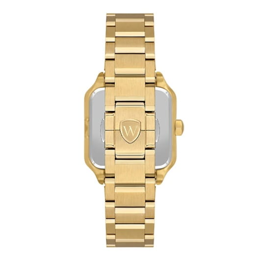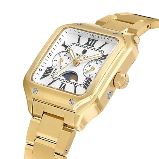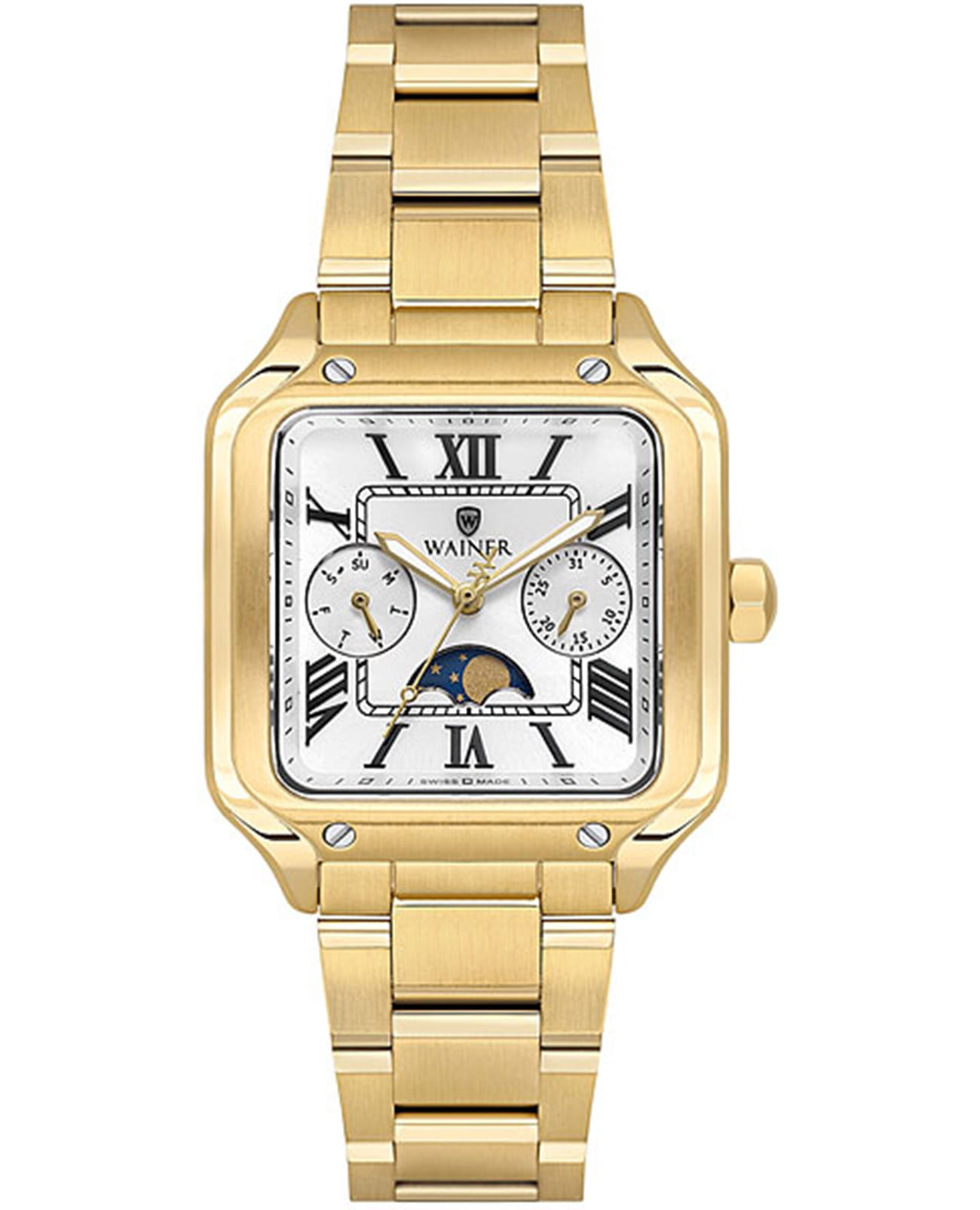 Женские кварцевые часы Wainer Vintage — это изысканный аксессуар, сочетающий в себе швейцарское качество и элегантный дизайн. Модель выполнена в квадратной форме из нержавеющей стали 316L с PVD-покрытиемPVDУльтратонкое покрытие наносится в технике вакуумного напыления, сочетает в себе нитрид титана особой прочности со слоем золота или оксида хрома. Несёт в себе декоративную или защитную функцию., что придаёт ей устойчивость к царапинам и благородный внешний вид. Циферблат белого цвета дополнен индикатором фазы Луны, датой и днём недели, а его поверхность защищена сапфировым стекломСапфировое стеклоПрочный и надёжный материал из кристалла сапфира синтетического происхождения, характеризующийся особой твёрдостью и устойчивостью к царапинам и повреждениям., устойчивым к повреждениям. Гранёная заводная головка с защитой обеспечивает надёжную фиксацию на запястье. Браслет из стали с покрытием шириной 16 мм оснащён Раскладная застёжкаРаскладная застёжкаТакой тип застёжки используется только на браслетах из металла. Она никогда не раскрывается полностью, происходит разделение на 2 и более частей. Раскладывающая застёжка снизит вероятность потери часов к минимуму., обеспечивающей комфорт и надёжную фиксацию. Часы водонепроницаемы до 50 метров (, что позволяет использовать их при мытье рук или под лёгким дождём. Стрелки и индексы имеют Люминесцентное покрытиеЛюминесцентное покрытиеПозволяет считывать показания времени в темноте. Производители наносят на стрелки, часовые индексы, безель или поверхность циферблата светонакопительный состав, дающий холодное свечение., обеспечивающее отличную читаемость даже в условиях слабого освещения. Механизм калибра Ronda 706.1 гарантирует точность хода и надёжность. Эти часы станут универсальным аксессуаром для тех, кто ценит сочетание стиля, функциональности и швейцарского мастерства — идеальный выбор для повседневной носки и торжественных случаев.