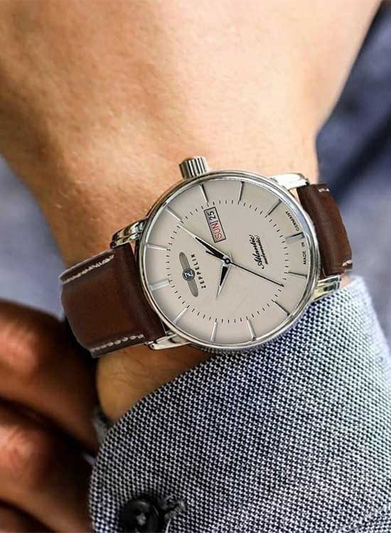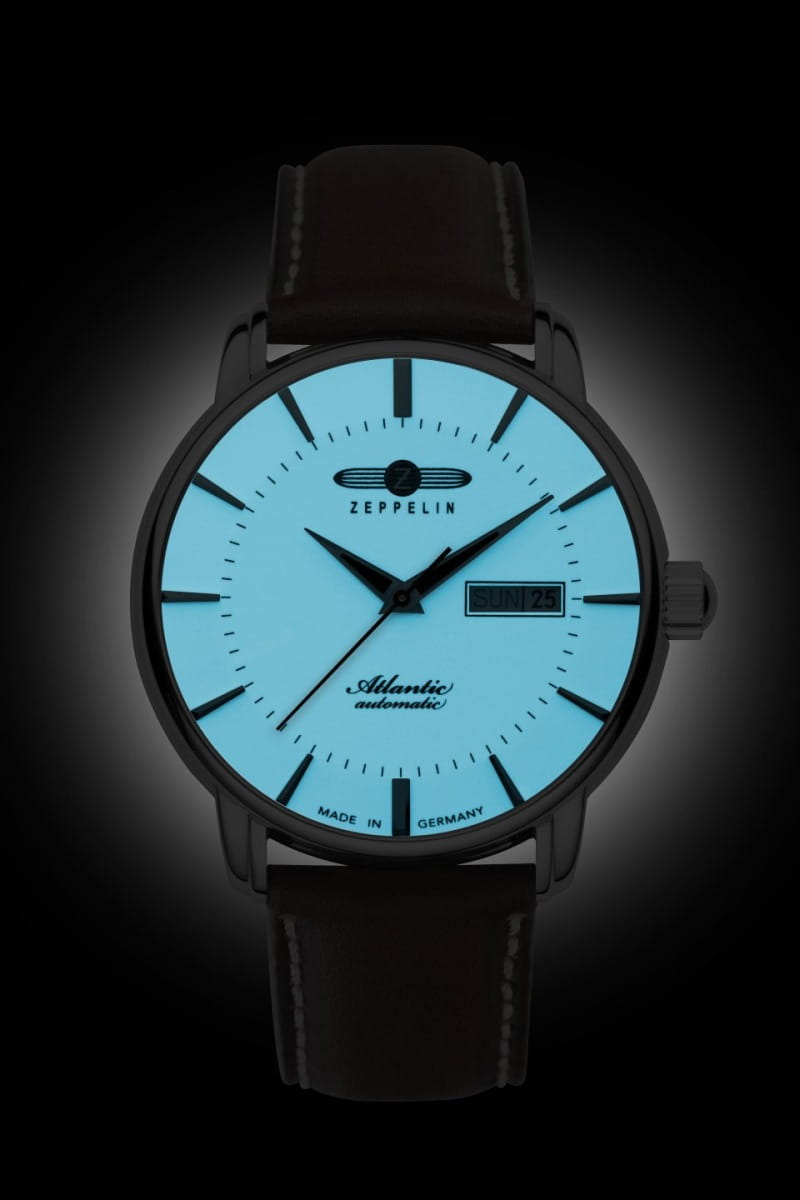 Часы Zeppelin 8466-5 — это квинтэссенция элегантности и точности.  Изготовленная из полированной нержавеющей стали, эта модель отличается циферблатом, который полностью покрыт люминесцентным покрытиемЛюминесцентное покрытиеПозволяет считывать показания времени в темноте. Производители наносят на стрелки, часовые индексы, безель или поверхность циферблата светонакопительный состав, дающий холодное свечение., благодаря чему светится в темноте, также он идеально сочетается с коричневым кожаным ремешком. Автоматический механизм обеспечивает надежность и долговечность, также есть дополнительные функции, такие как индикация дня месяца и недели. Закаленное минеральное стеклоМинеральное стеклоМинеральное стекло представляет собой искусственно выращенный минерал кварца. Такое стекло отличается особой устойчивостью к повреждениям и царапинам. Уступает по некоторым качествам сапфировому стеклу. защищает от царапин, что делает его идеальным выбором для любого джентльмена. Кроме того, водонепроницаемость часов составляет 50 метров, так что вы можете спокойно принимать в них душ. Эти часы подойдут для повседневного ношения и станут ярким акцентом в вашем наряде.